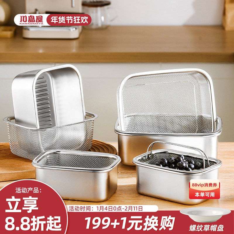 川岛屋不锈钢保鲜盒食品级带盖密封收纳盒蔬果沥水篮子水果便当盒