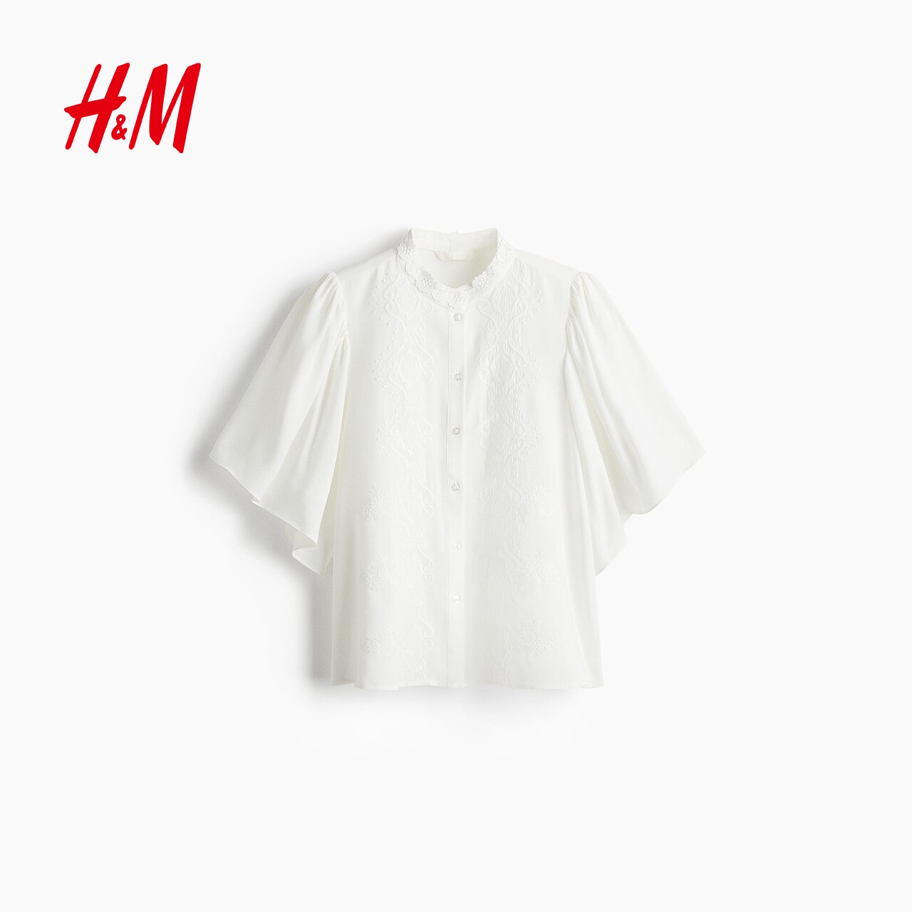 HM女装衬衫春季蝴蝶袖简约潮流时尚刺绣上衣1295098