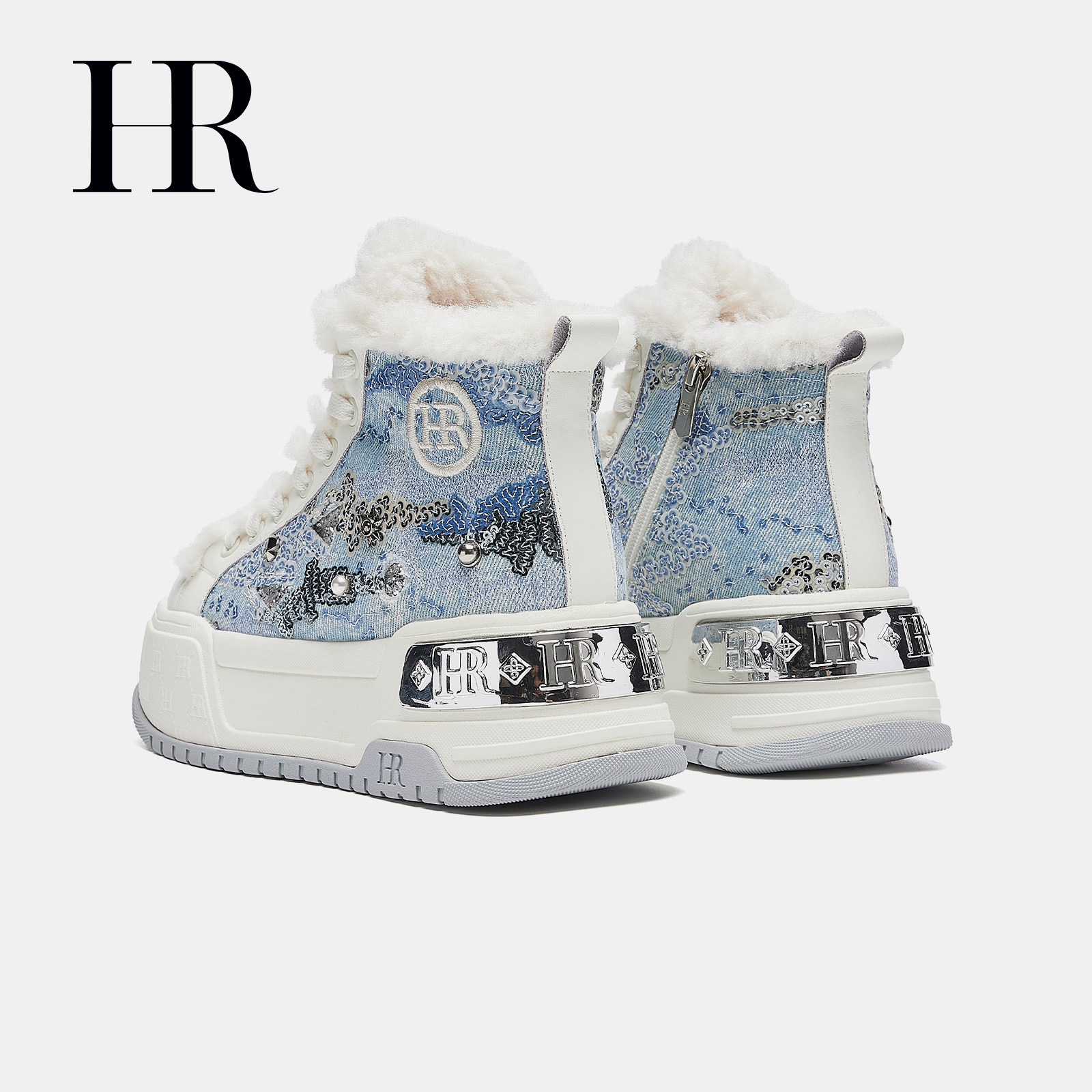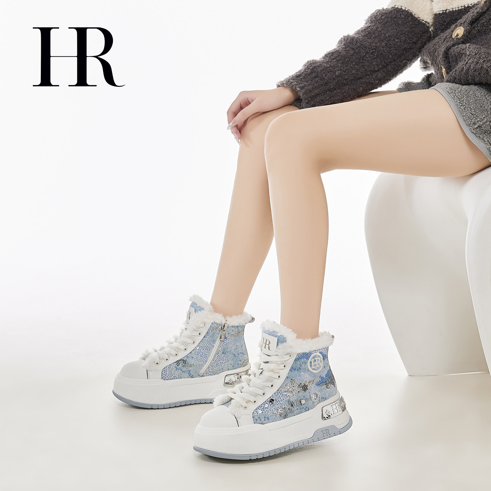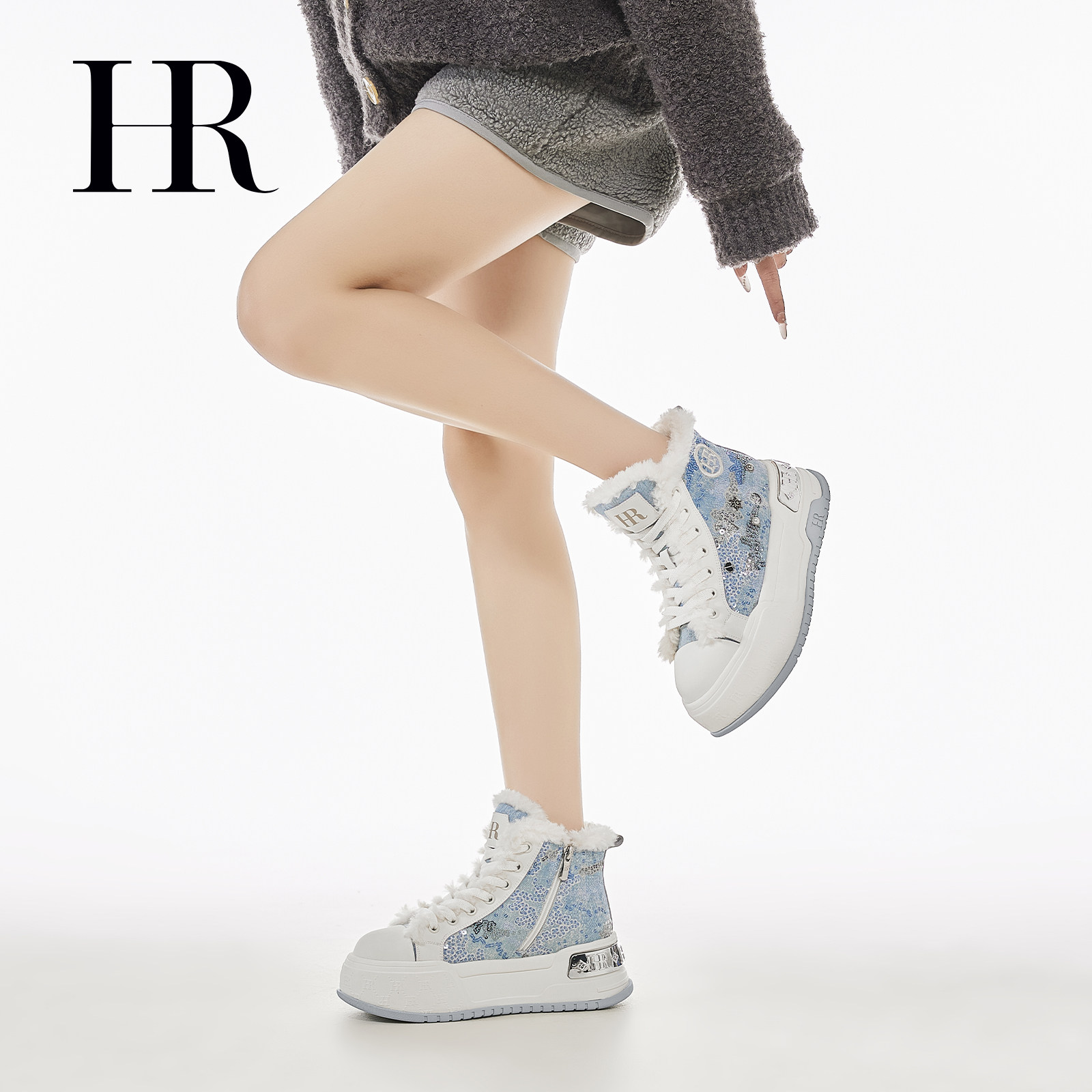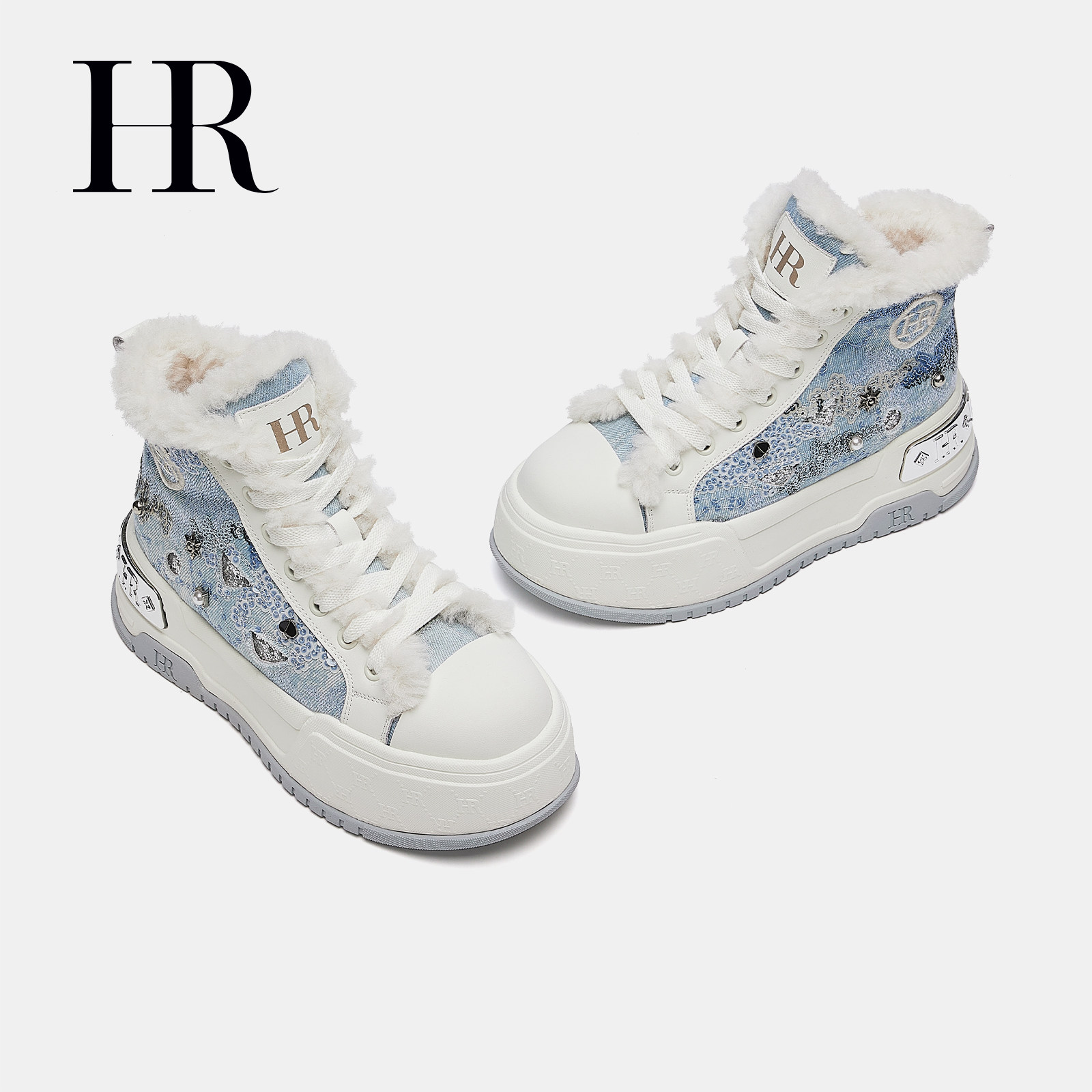 HR赫莲娜高帮鞋2025冬季新款女鞋子厚底牛仔加绒保暖休闲雪地靴潮