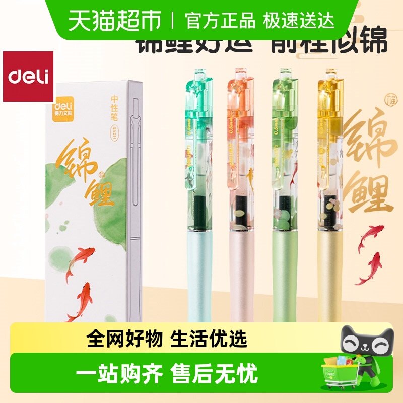 得力锦鲤速干中性笔学生按动黑笔0.5顺滑刷题水笔考试笔ST头