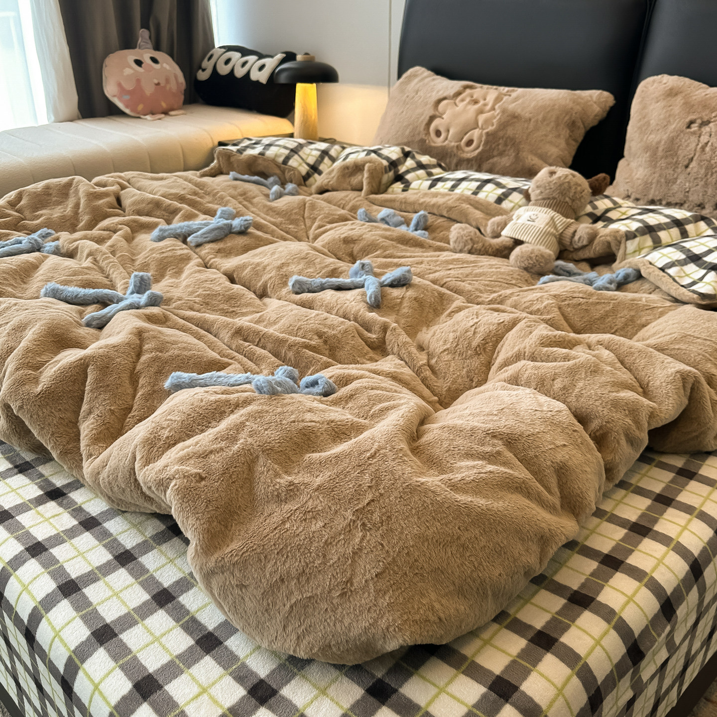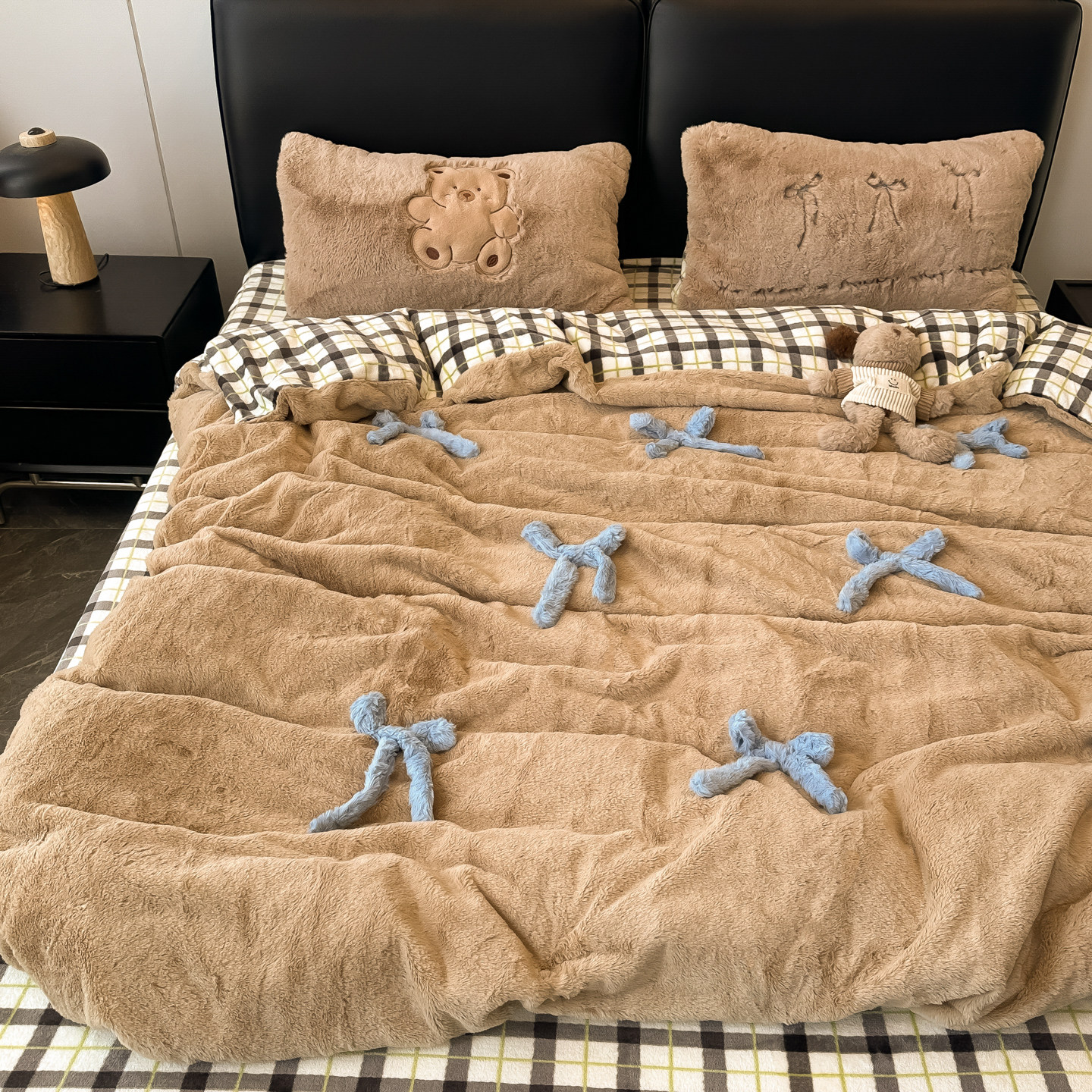 加厚牛奶绒床上四件套可爱立体蝴蝶结被套珊瑚绒床单人宿舍三件套
