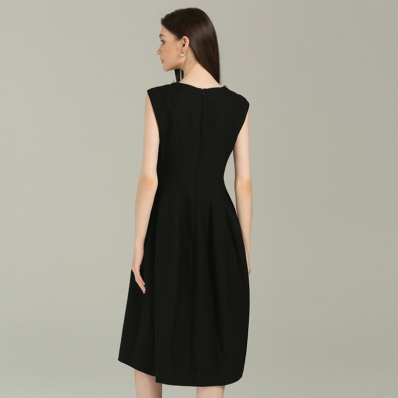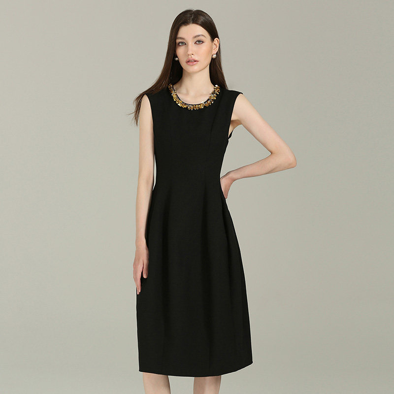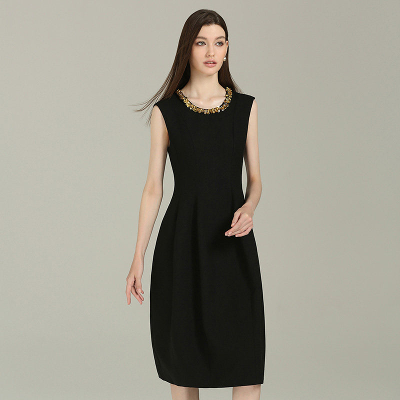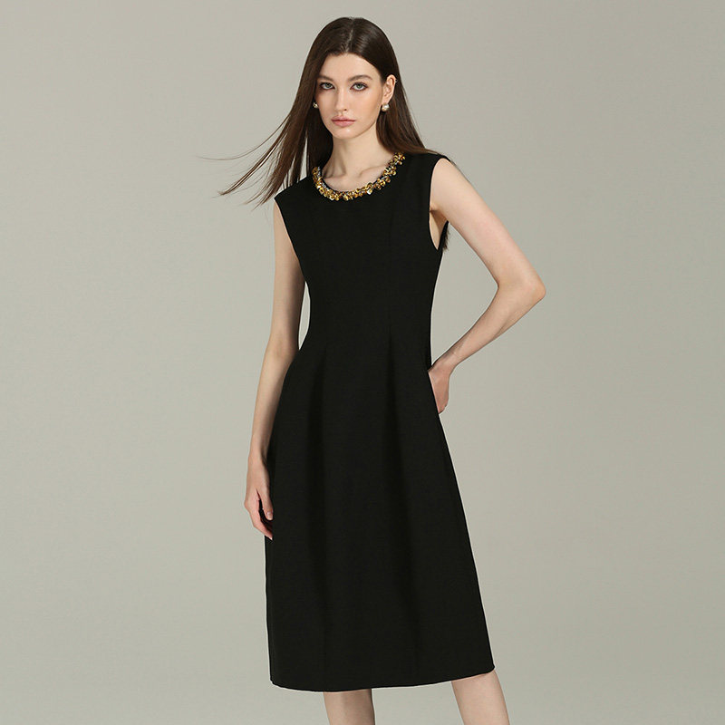 DONEED秋款优雅圆领亮片钉钻奢华设计感无袖背心纯色连衣裙女