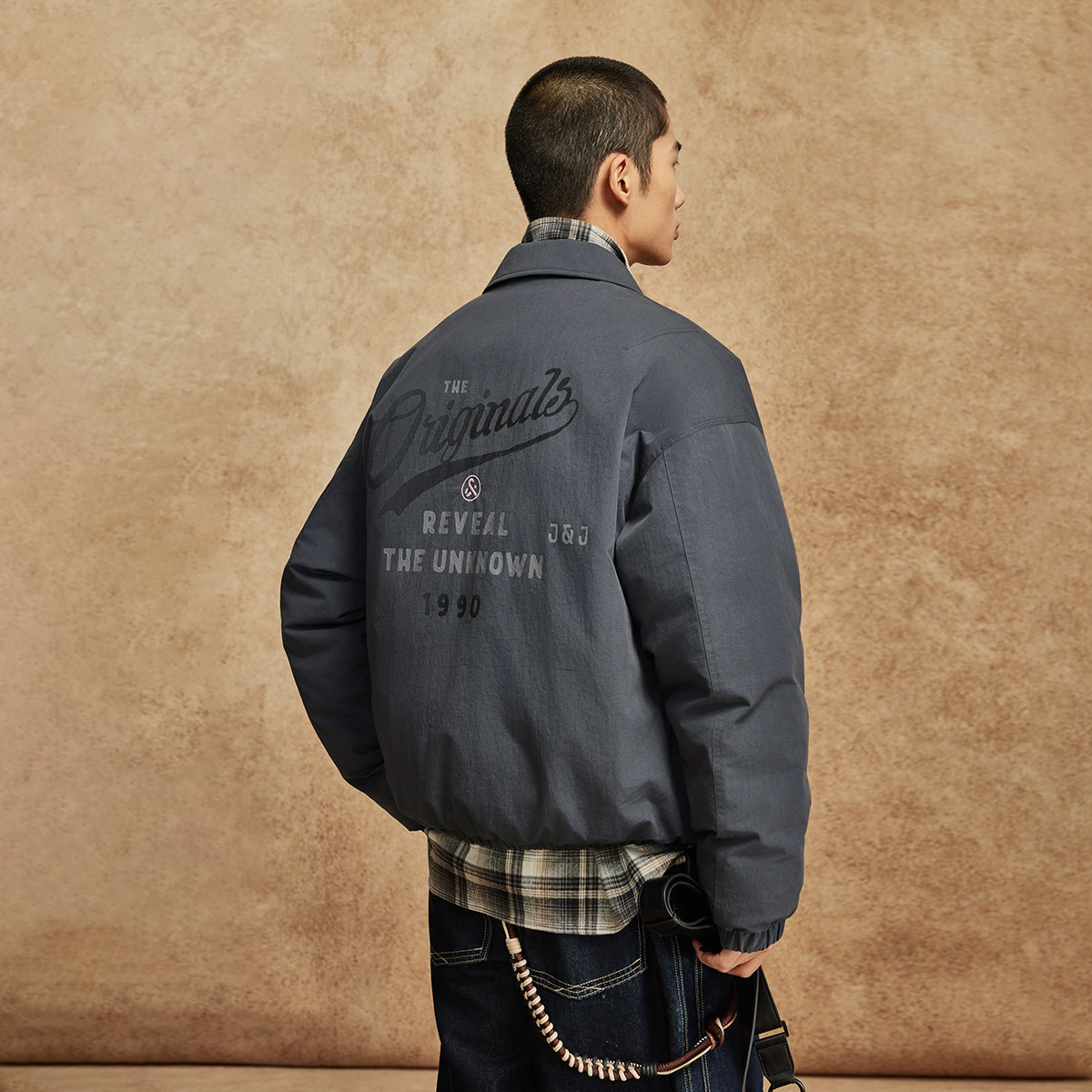 略宽松版型;翻领领型;拉链门襟;灰鸭绒