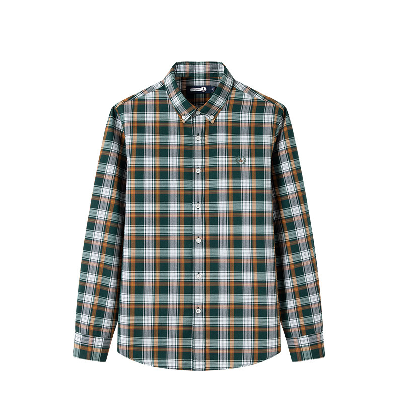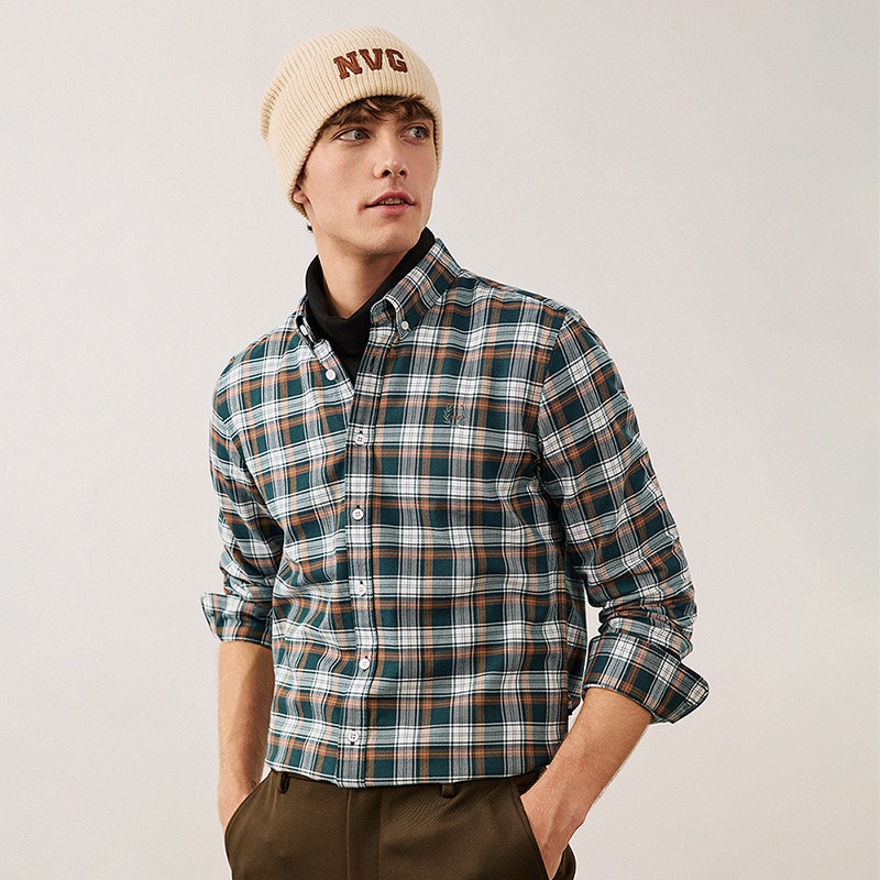 啄木鸟秋季新款男士长袖100%全纯棉磨毛格子衬衫 高级感休闲衬衣