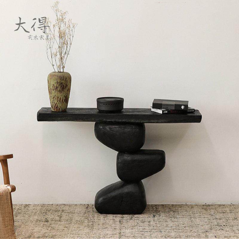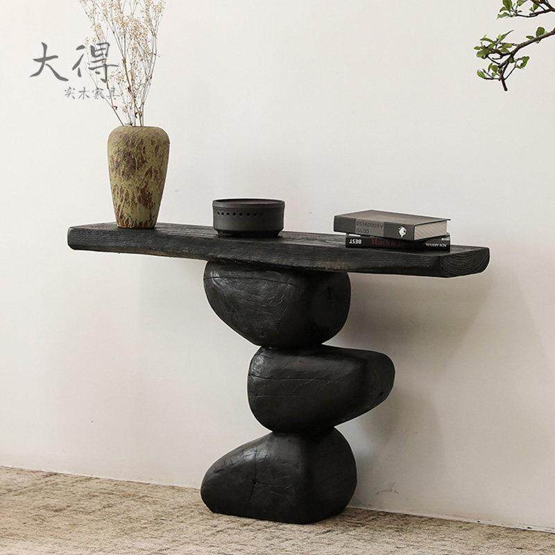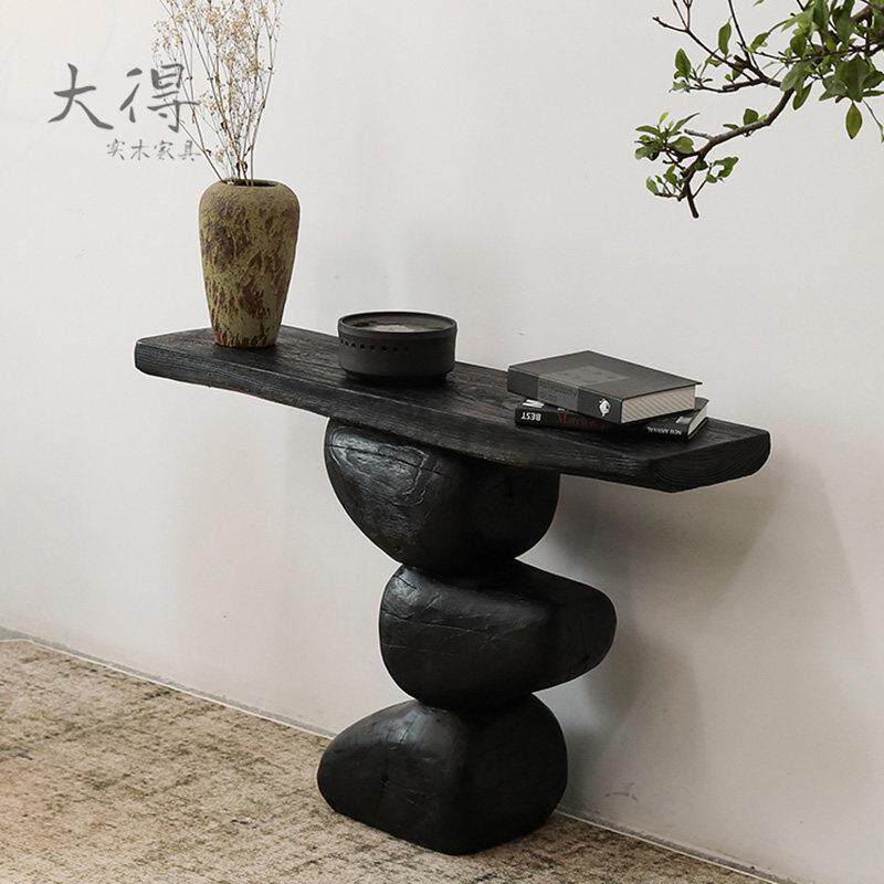 北欧实木入户玄关桌靠墙中堂案台侘寂风民宿设计师鹅卵石原木桌子