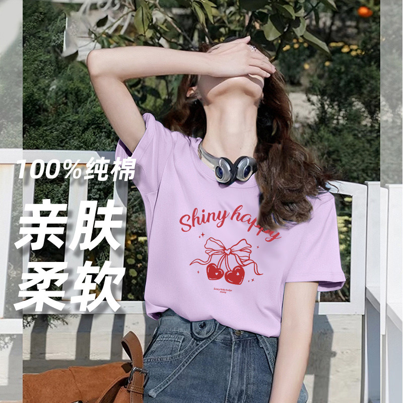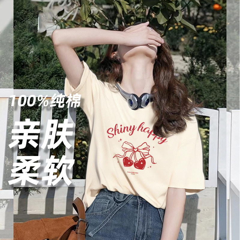 新国货100纯棉t恤女130支双面丝光棉短袖V圆领宽松大码夏季鸡心领