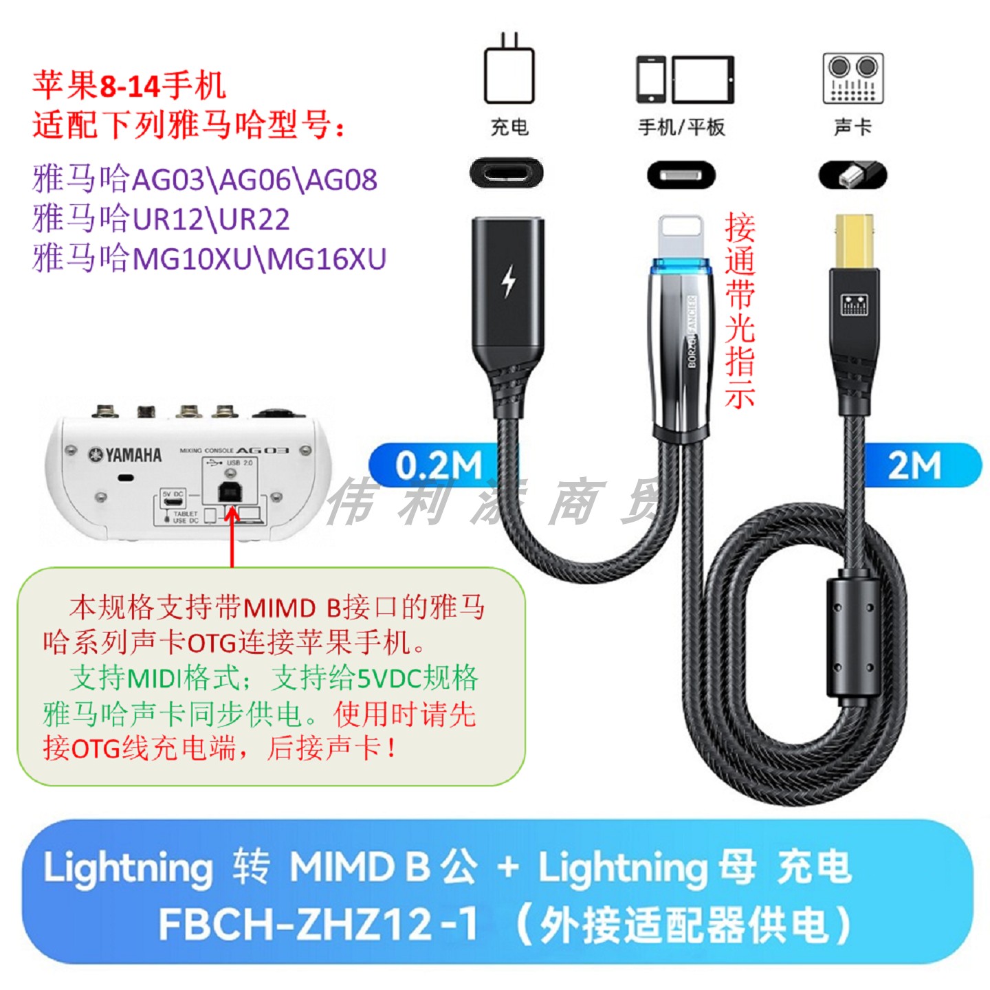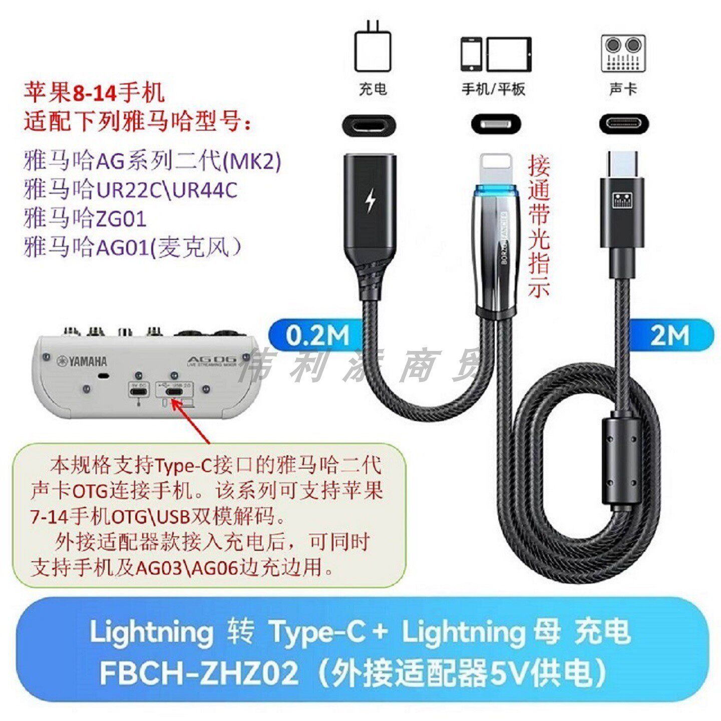 OTG直播线适用于雅马哈AG03\AG06\MG10\UR12\UR22C调音台声卡Yamaha连接手机边充电边直播