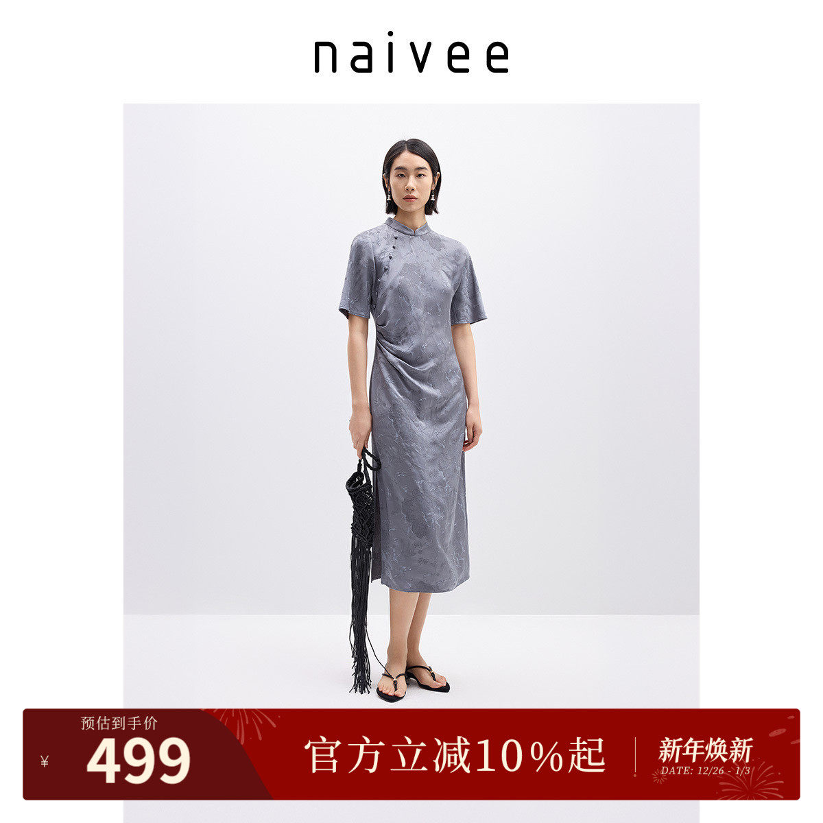 naivee纳薇新中式国风女装2025夏薄款人丝提花收腰改良旗袍连衣裙