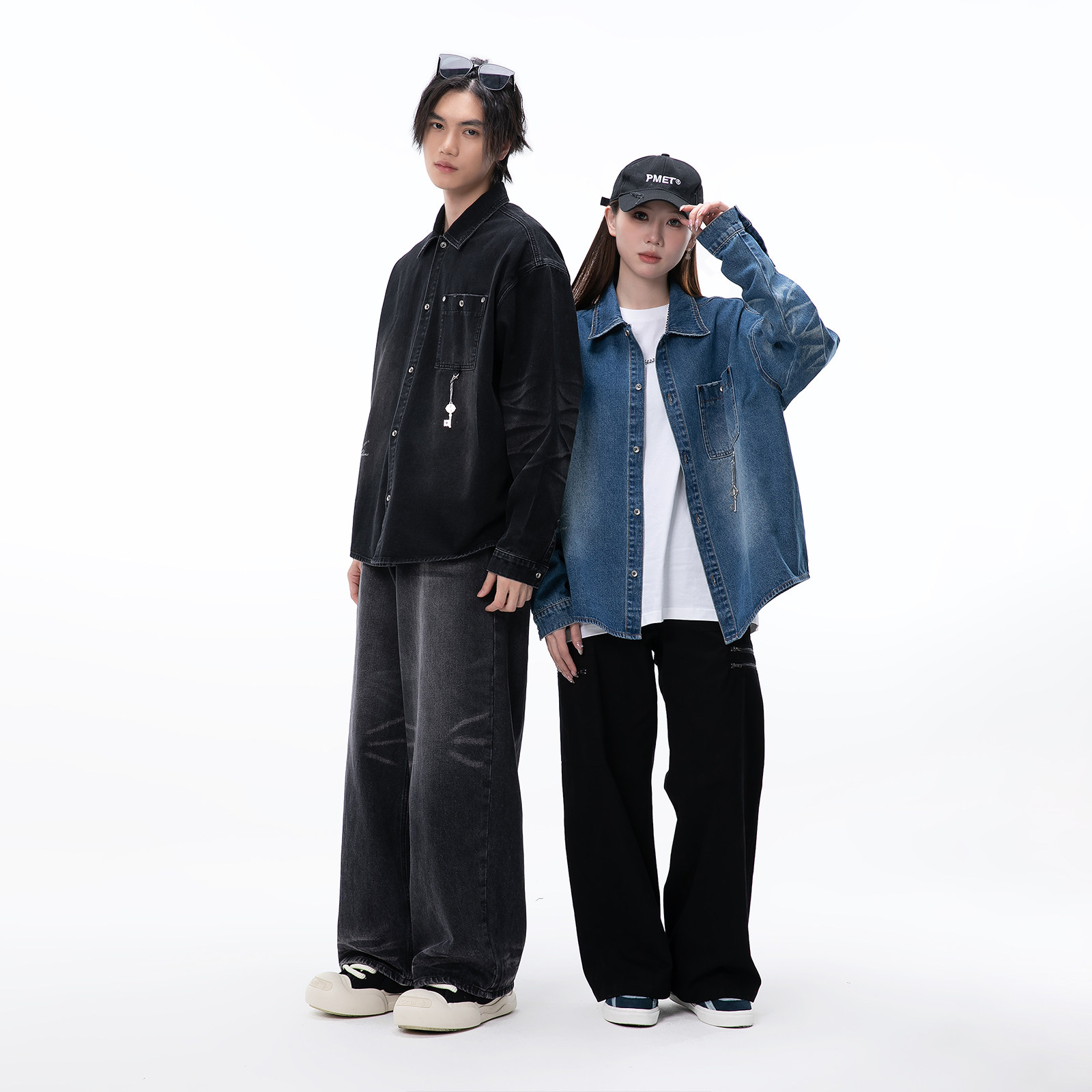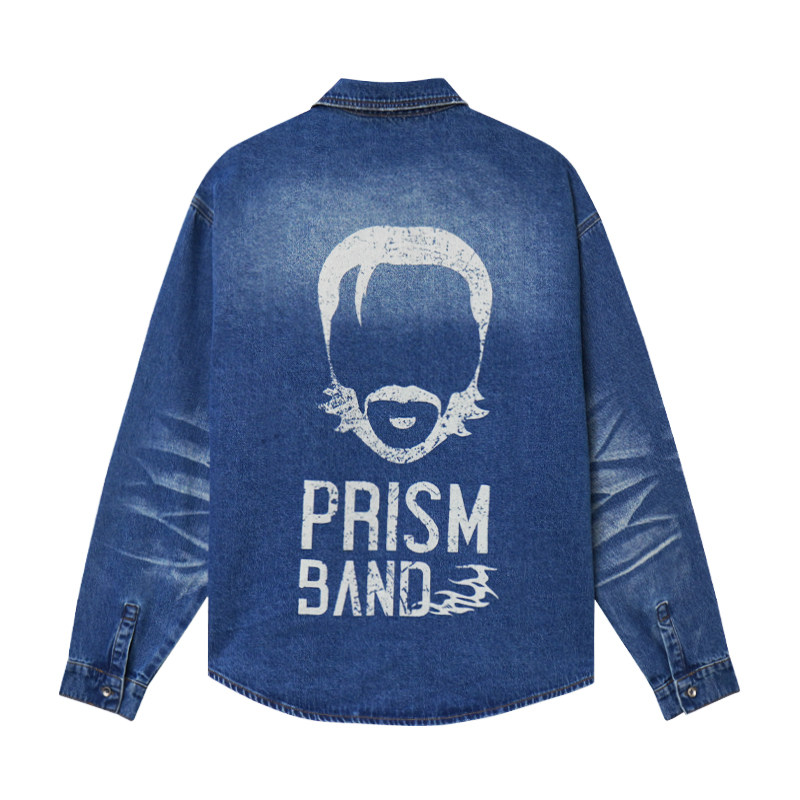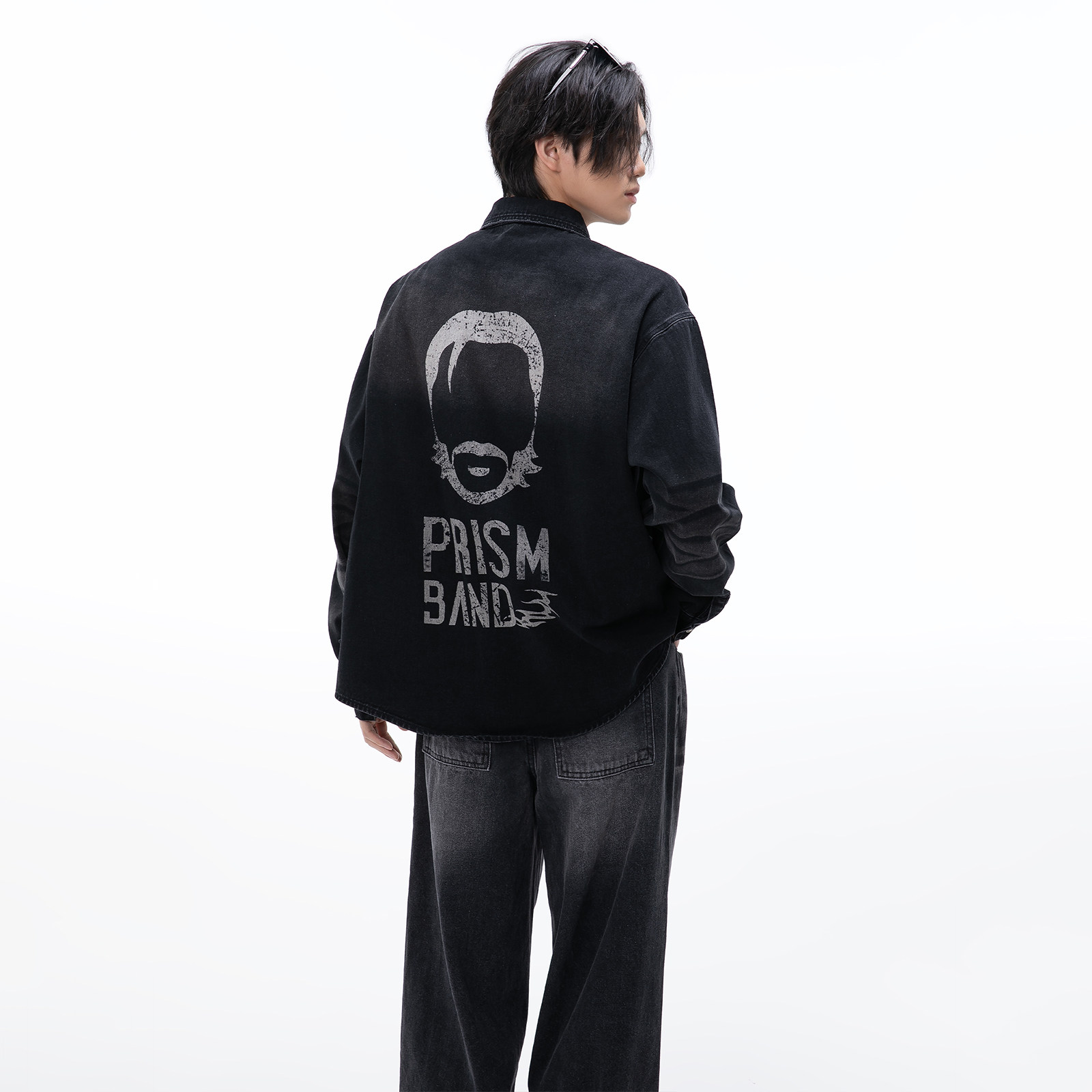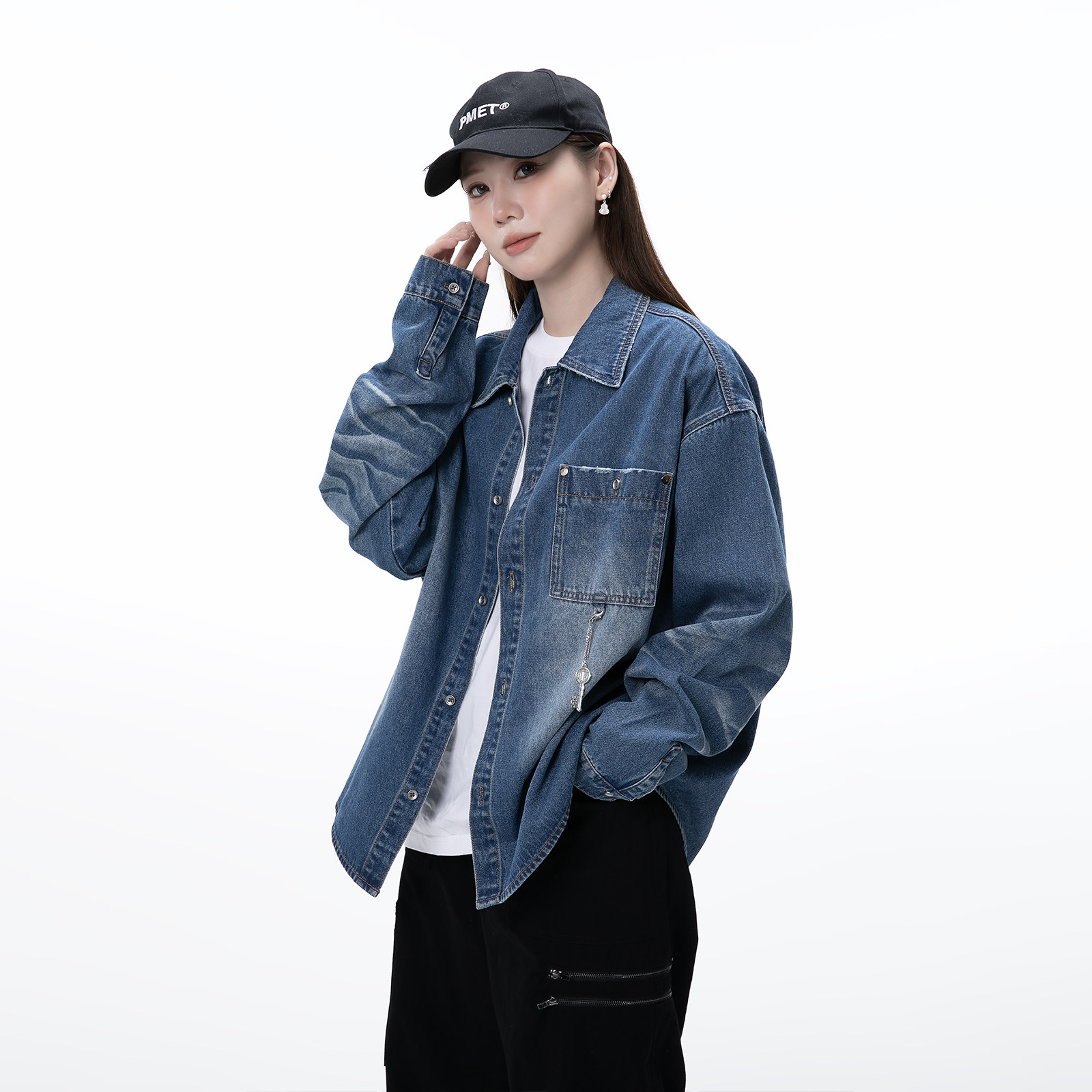 PMET 水洗牛仔印花衬衫 定制吊坠潮牌男春季宽松休闲磨破长袖外套