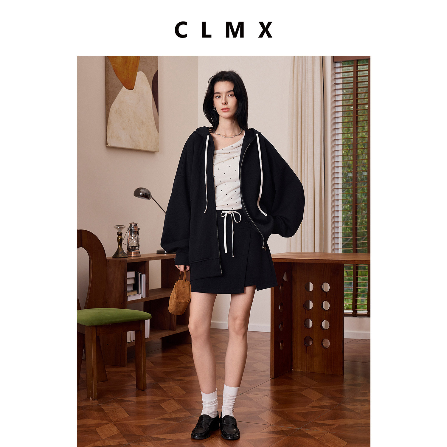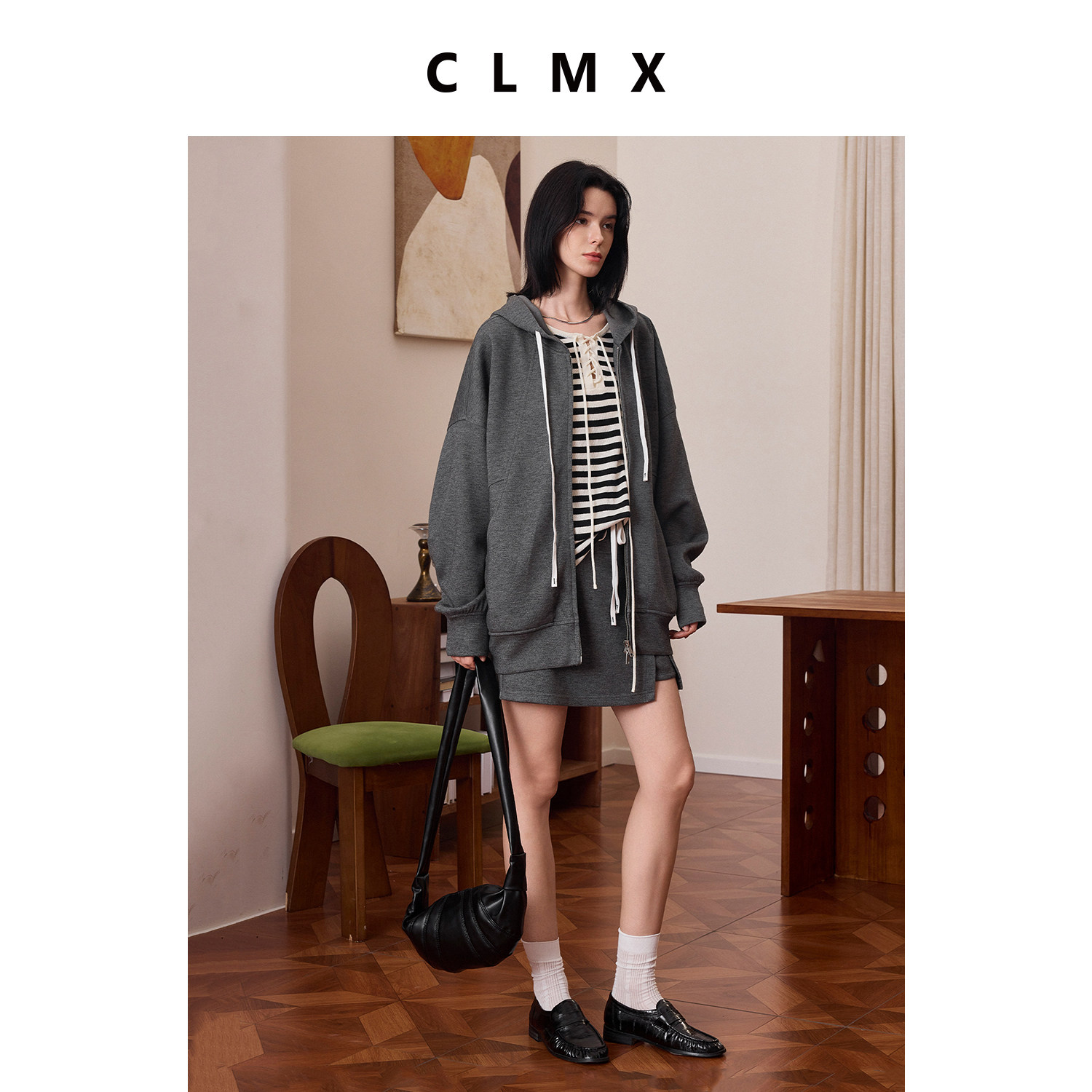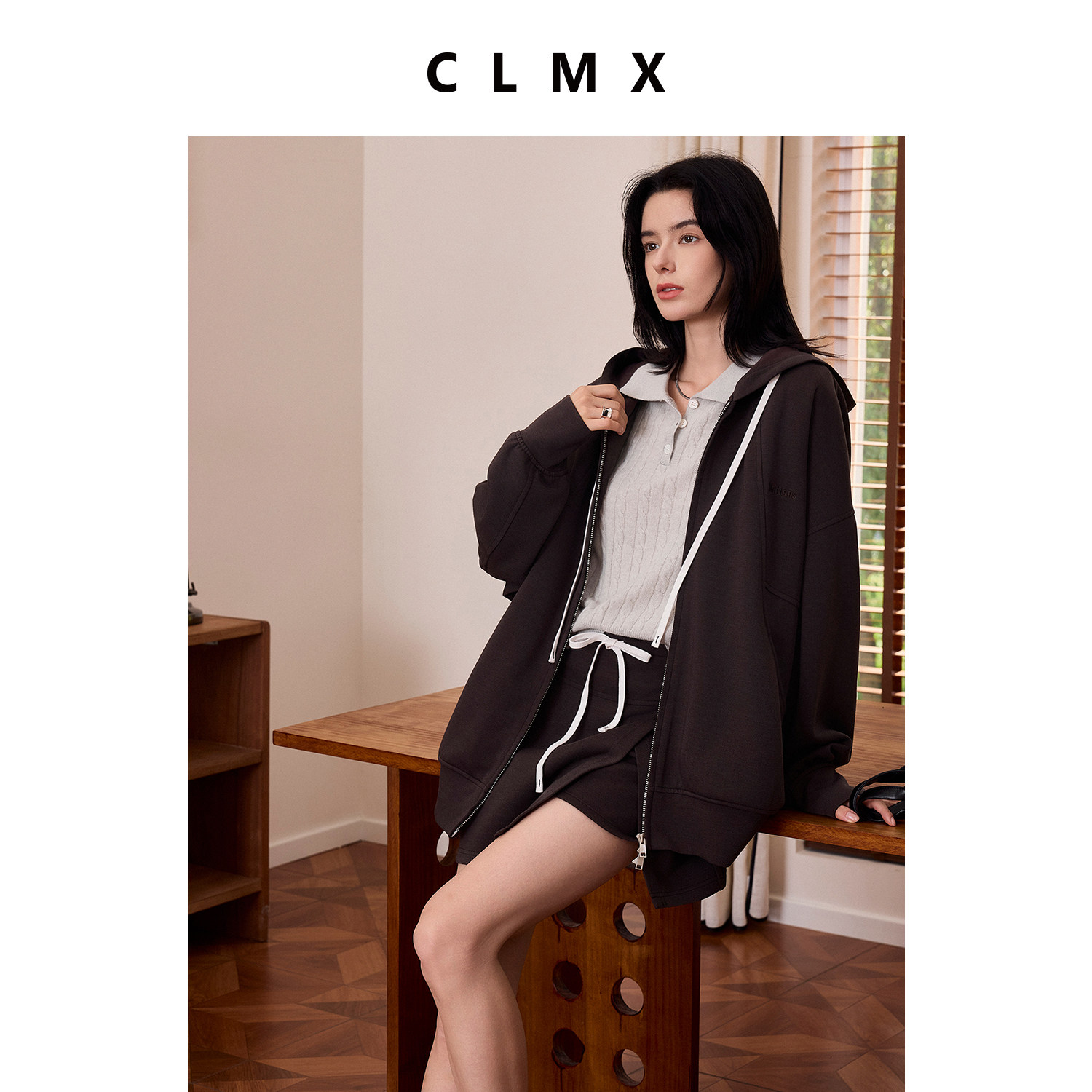 CLMX秋季宽松休闲两件套羊毛混纺复合针织布抽绳外套/拼接裙裤女