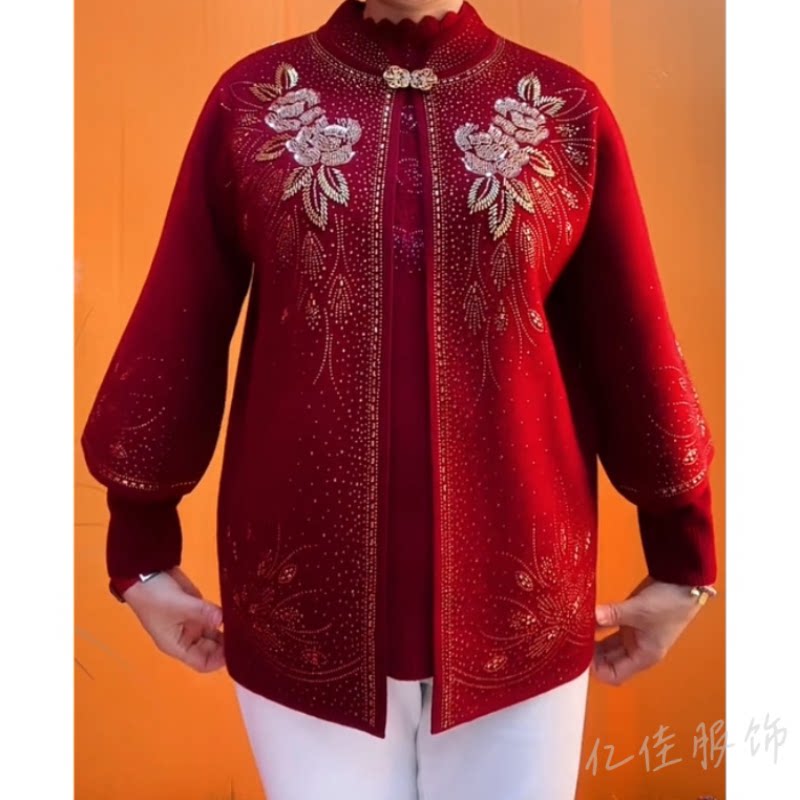 2026新款假两件针织衫妈妈装秋冬加绒加厚毛衣中老年女装保暖上衣