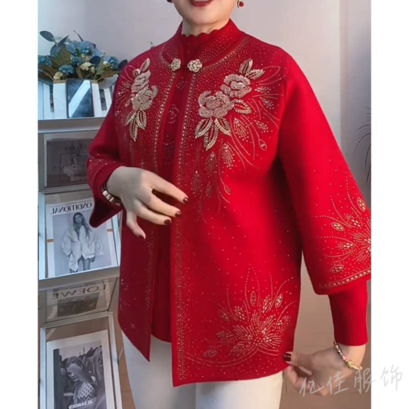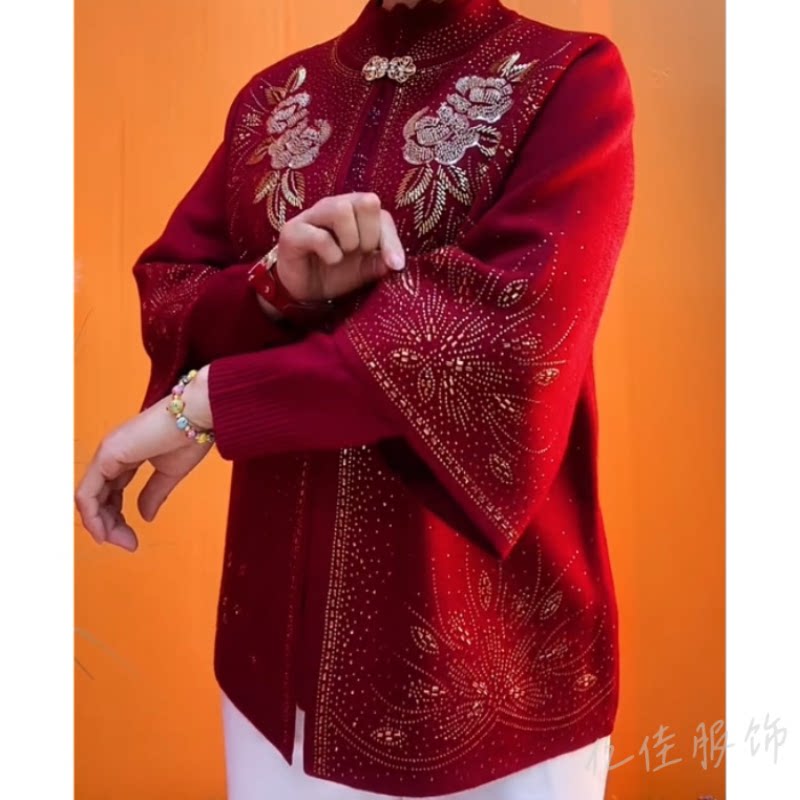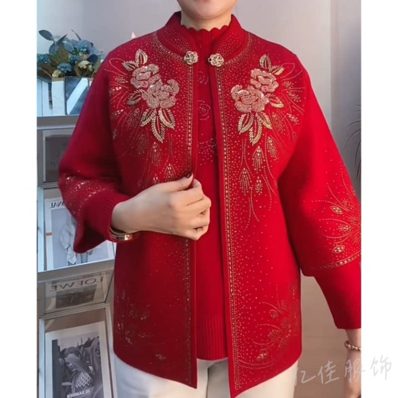 本命年妈妈装喜婆婆重工绣花串珠针织两件套中老年婚宴礼服套装女
