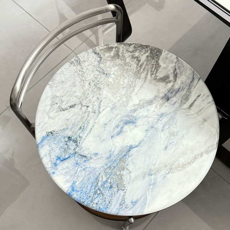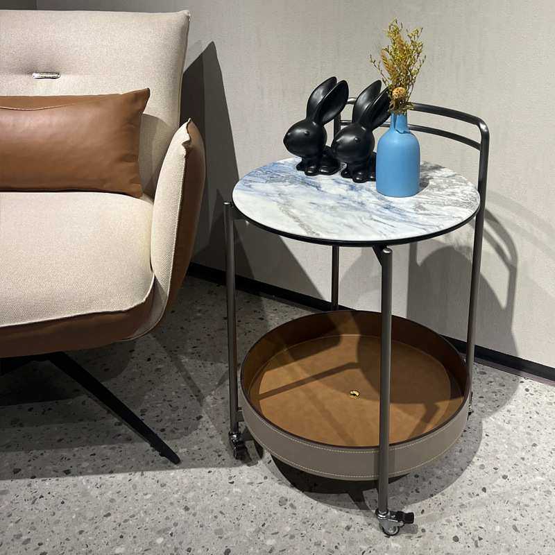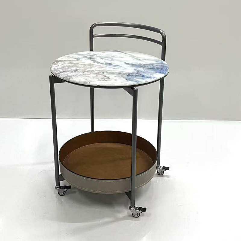 意式设计师沙发边几可移动轻奢高端马鞍皮客厅微晶石小推车厂家