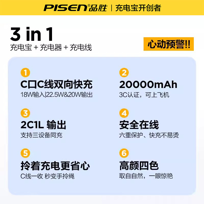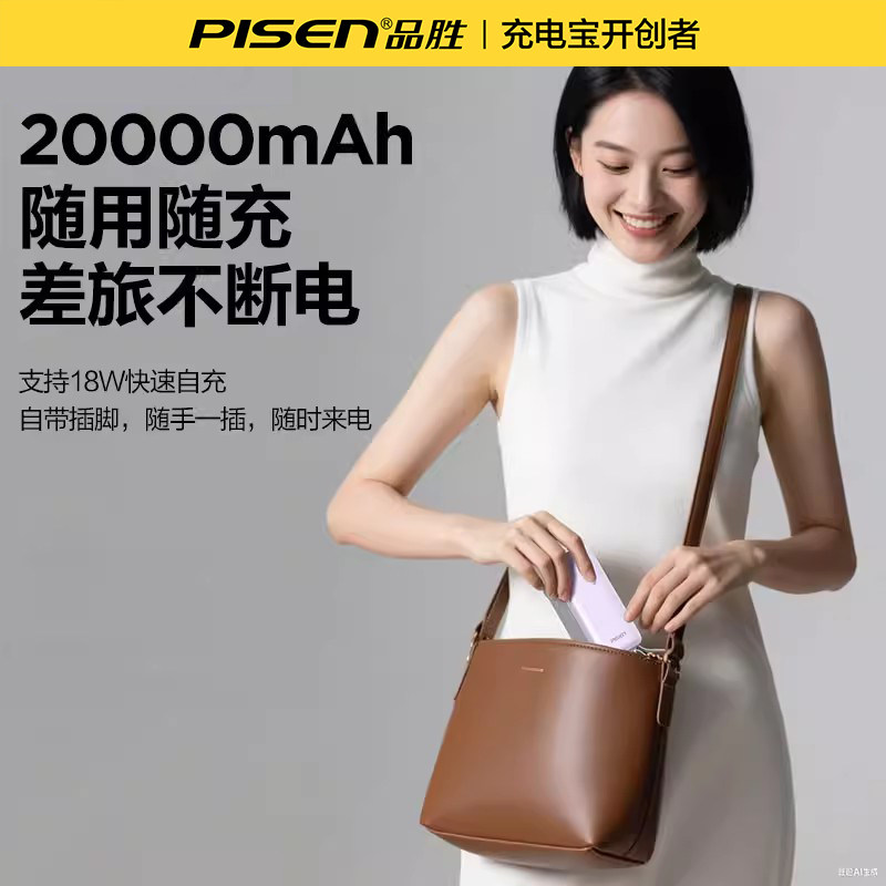 【3C认证充电宝】品胜自带插头20000毫安大容量10000充电器二合一电霸标识自带线适用苹果17小米移动电源