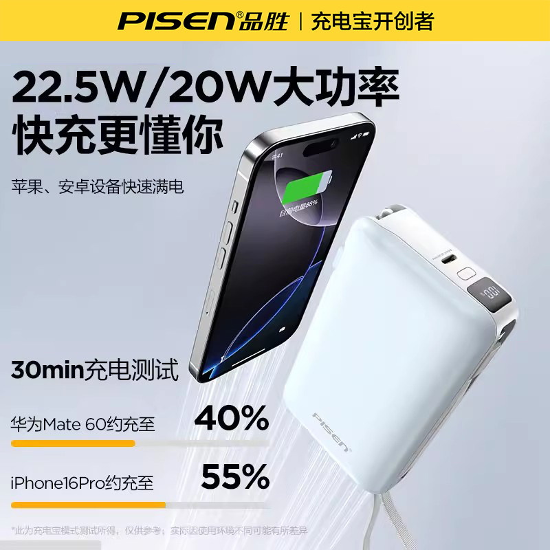 【充电宝3C认证可上飞机】品胜2026新款三合一自带插头22.5W双线快充大容量电霸移动电源适用苹果17官方正品