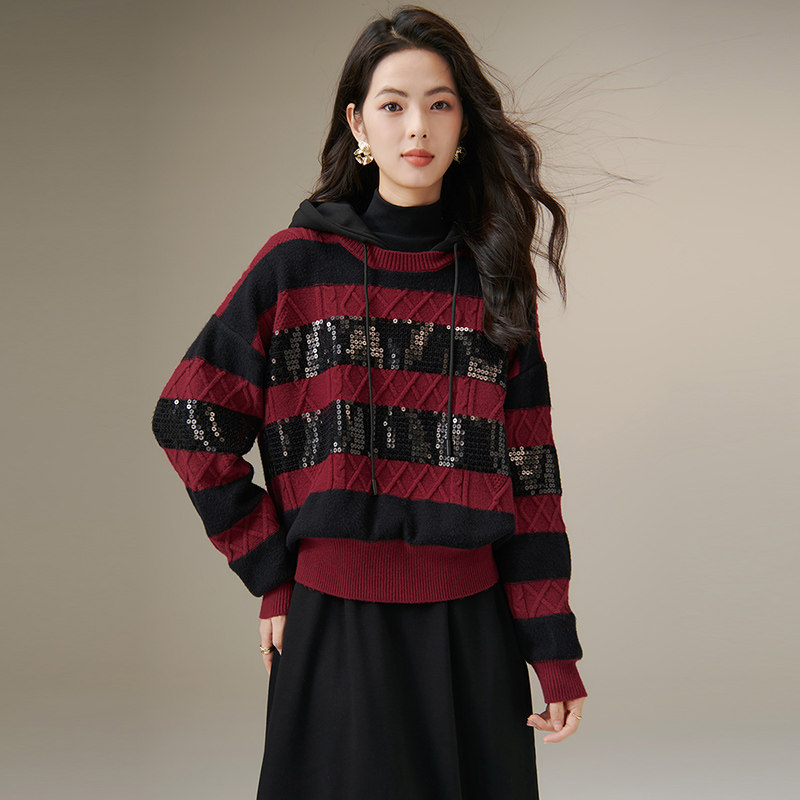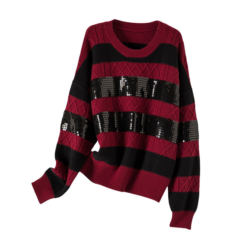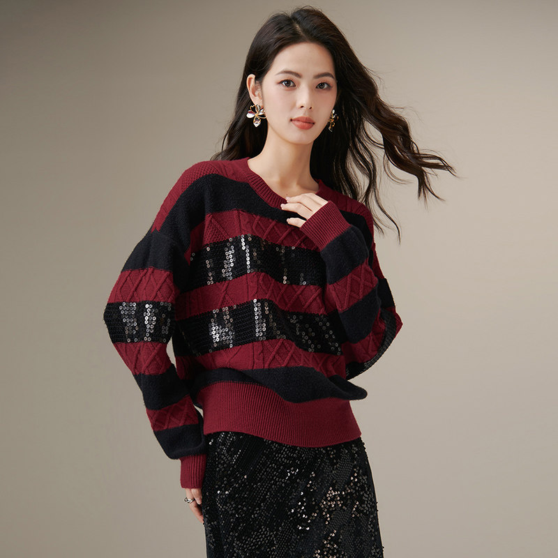 晚白2025年秋冬新款时尚圆领条纹新年上衣弹力大码亮片针织衫女