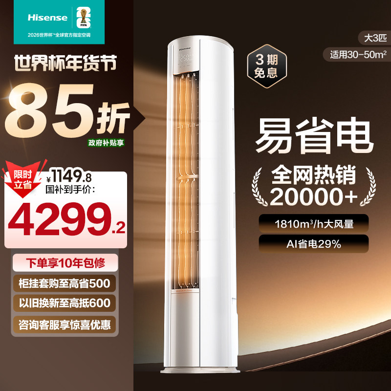 海信大3匹易省电立式空调柜机家用一级能效客厅以旧换新补贴官方