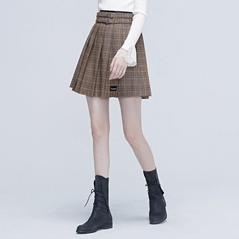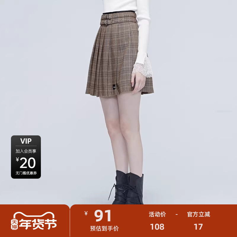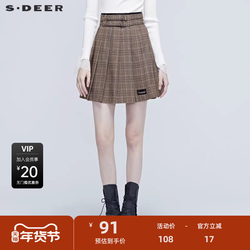 【秒杀】S·DEER圣迪奥秋通勤简约装撞色格纹压褶短裙S20381306