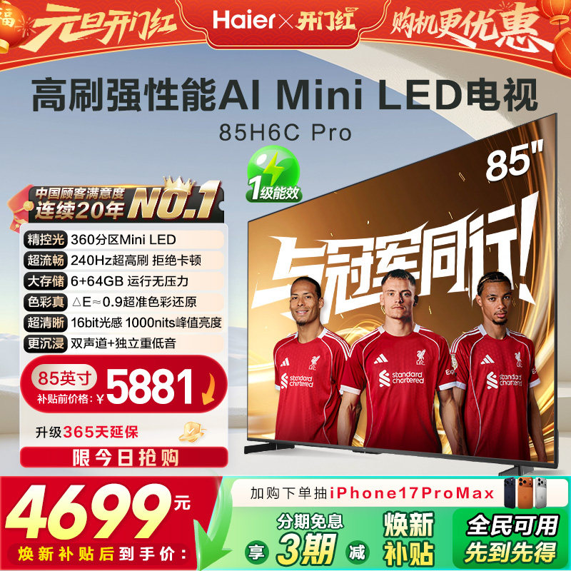 海尔电视85H6C Pro新款85英寸MiniLED液晶电视机家用以旧换新补贴