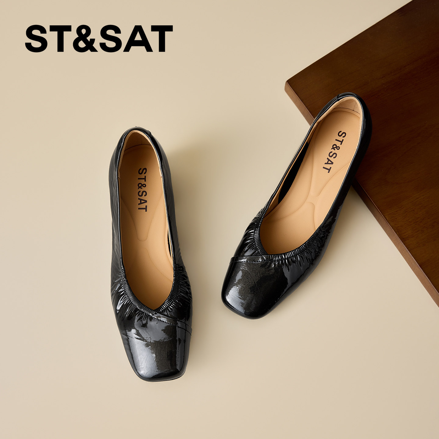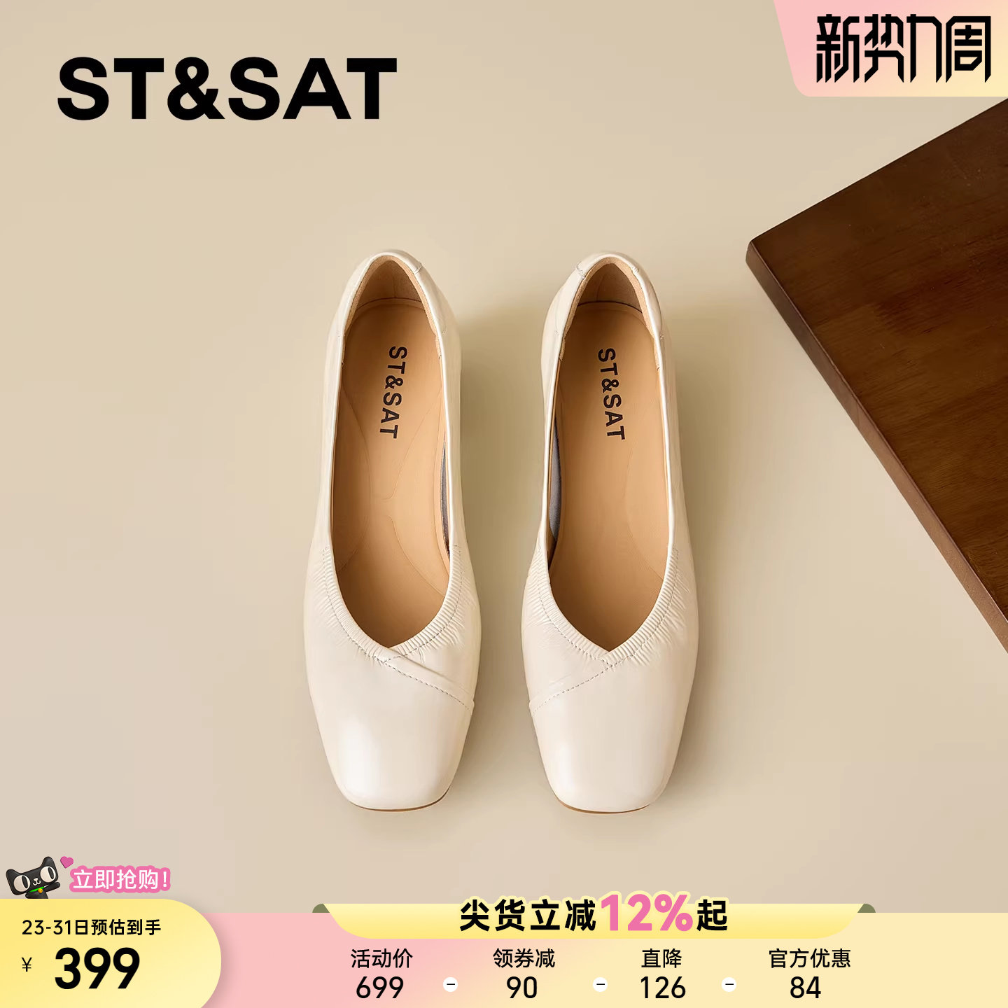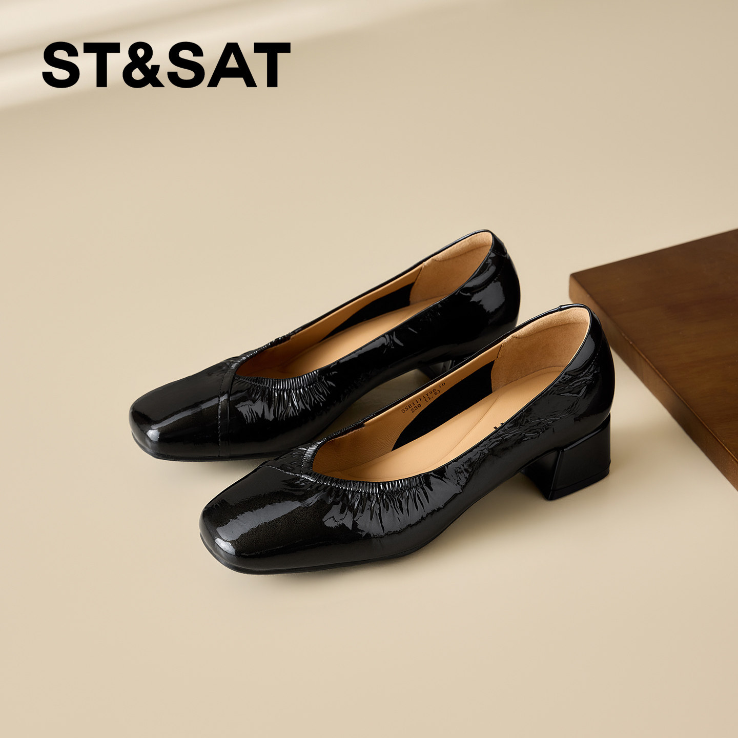 星期六真皮方头粗跟浅口单鞋女2026春季新款褶皱中跟一脚蹬通勤鞋