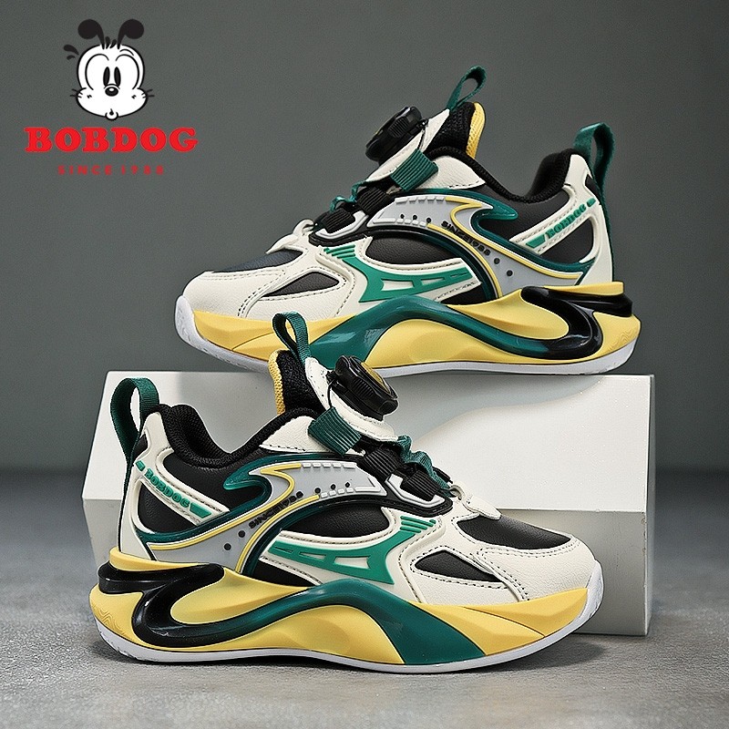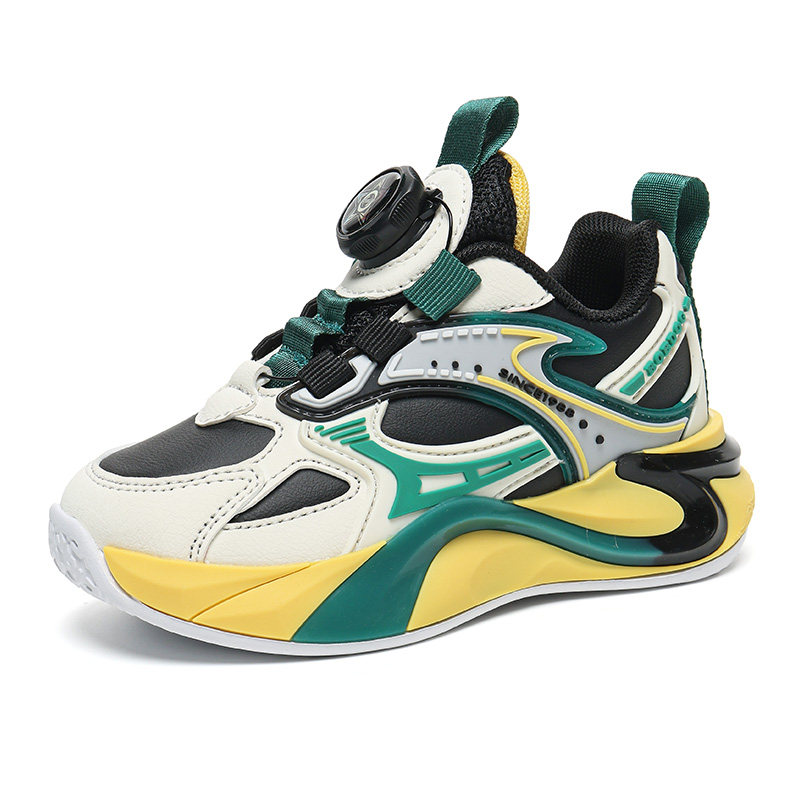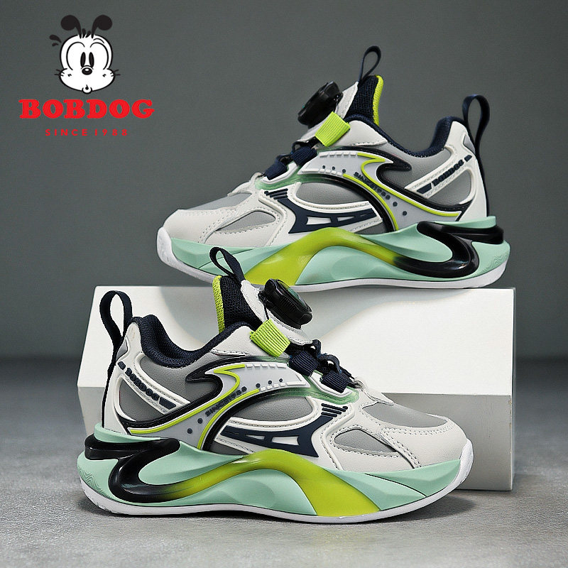 巴布豆男童跑步鞋春秋皮面防水2025新款旋转纽扣软底女童运动鞋子