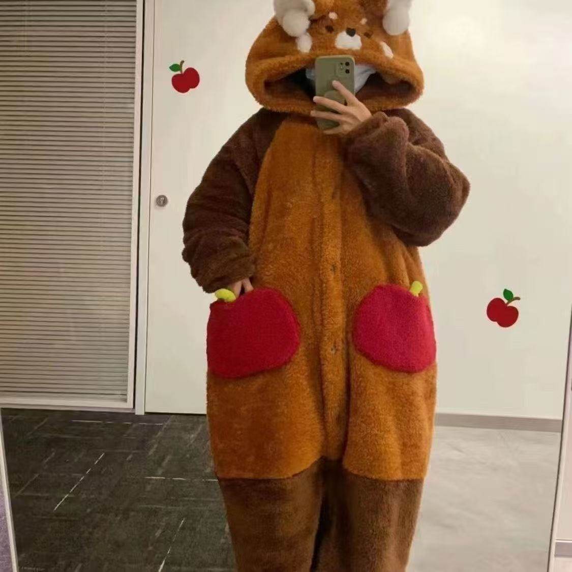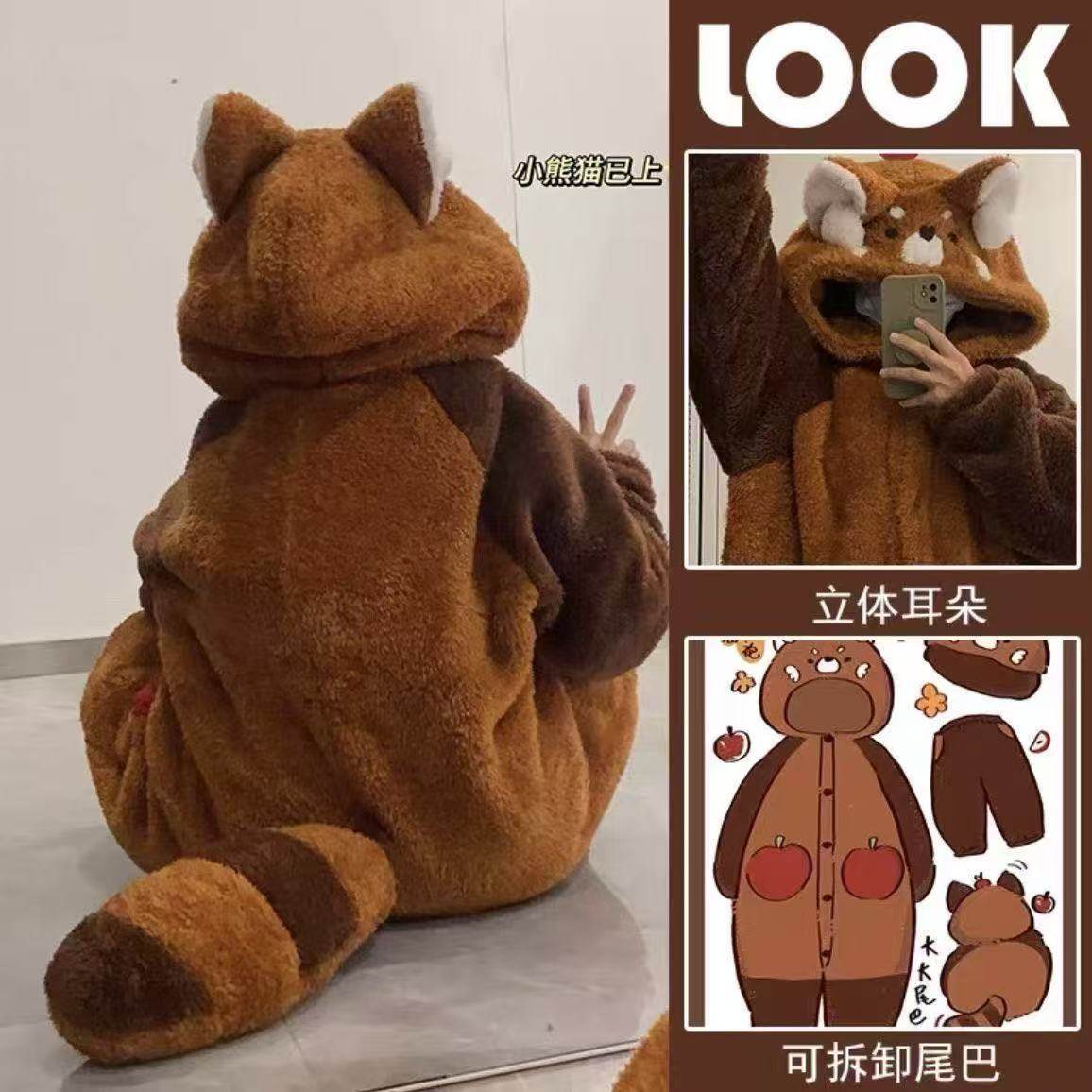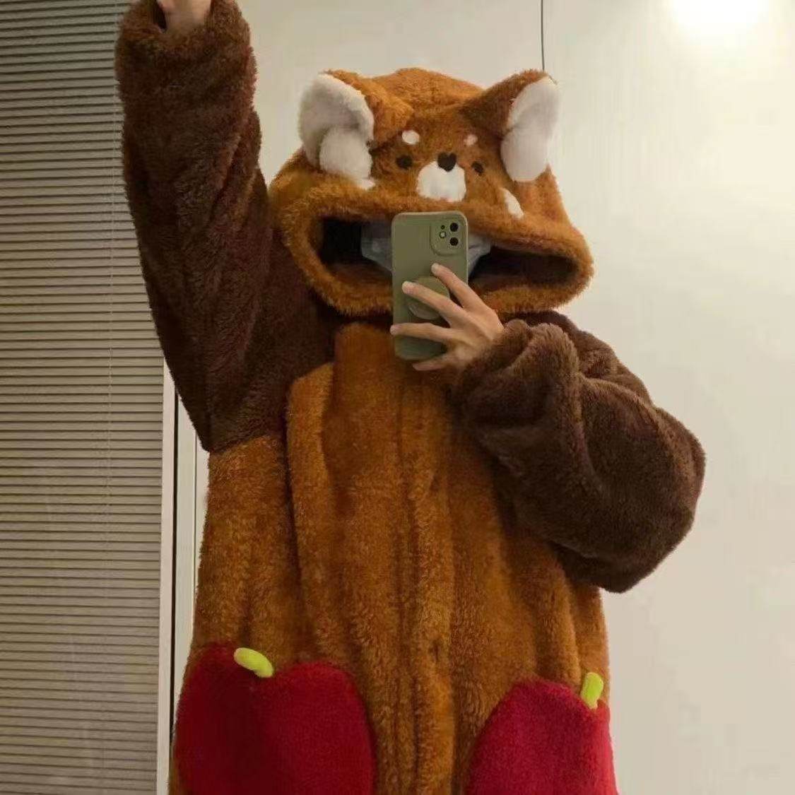 秋冬可爱小浣熊珊瑚绒睡袍女冬季加绒加厚居家服情侣睡衣绿色黑色