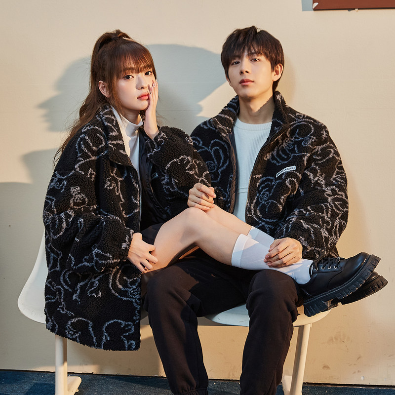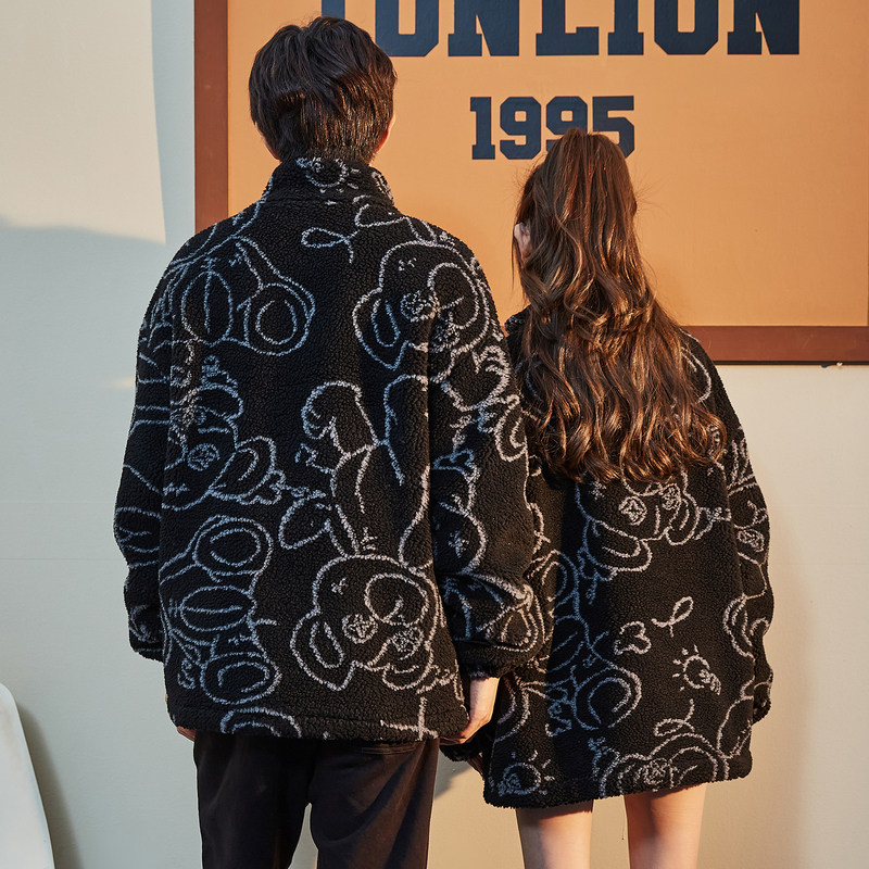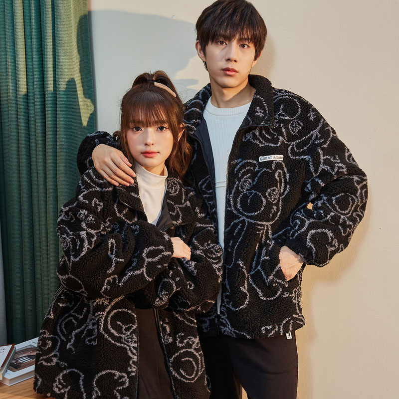 唐狮情侣款仿羊羔毛外套冬季小熊满印男女厚外套厚保暖夹克青少年