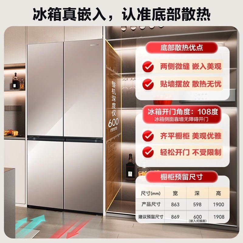 美的华凌神机547双系统超薄零嵌入式十字双开四门家用一级冰箱