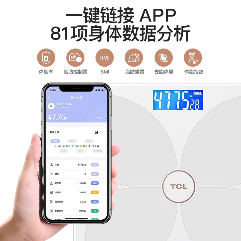 TCL体重体脂秤精准高精度电子称家用智能充电人体小型新款玻璃