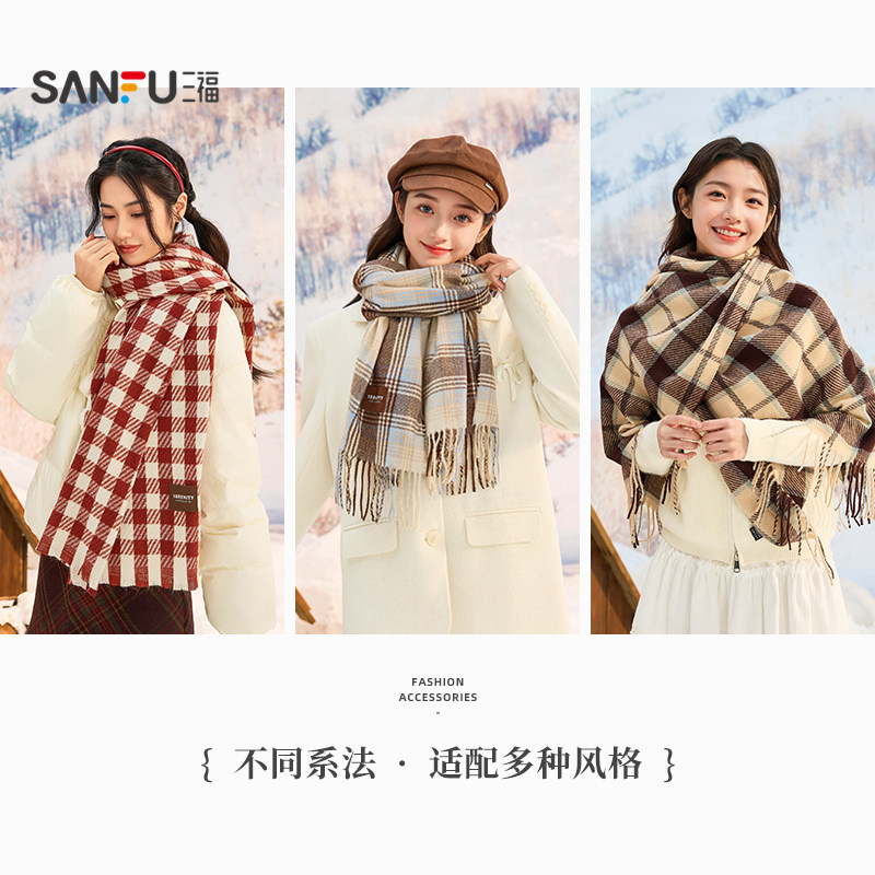 三福格子围巾时尚韩系高级感旅游看雪看海骑车围脖男女冬2025新款