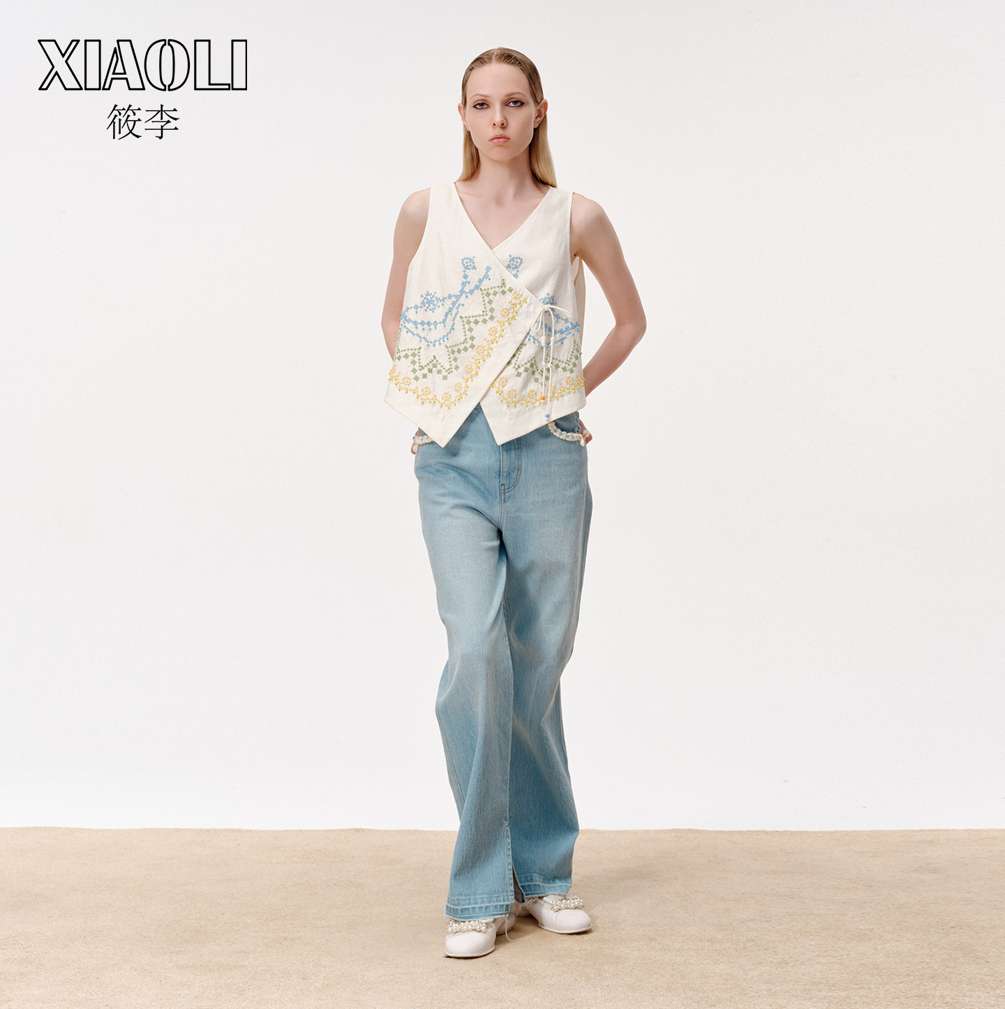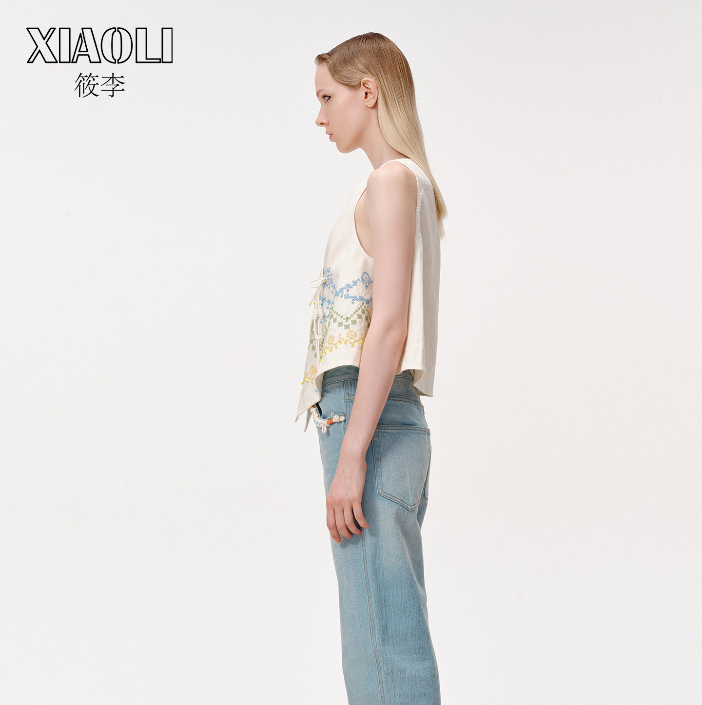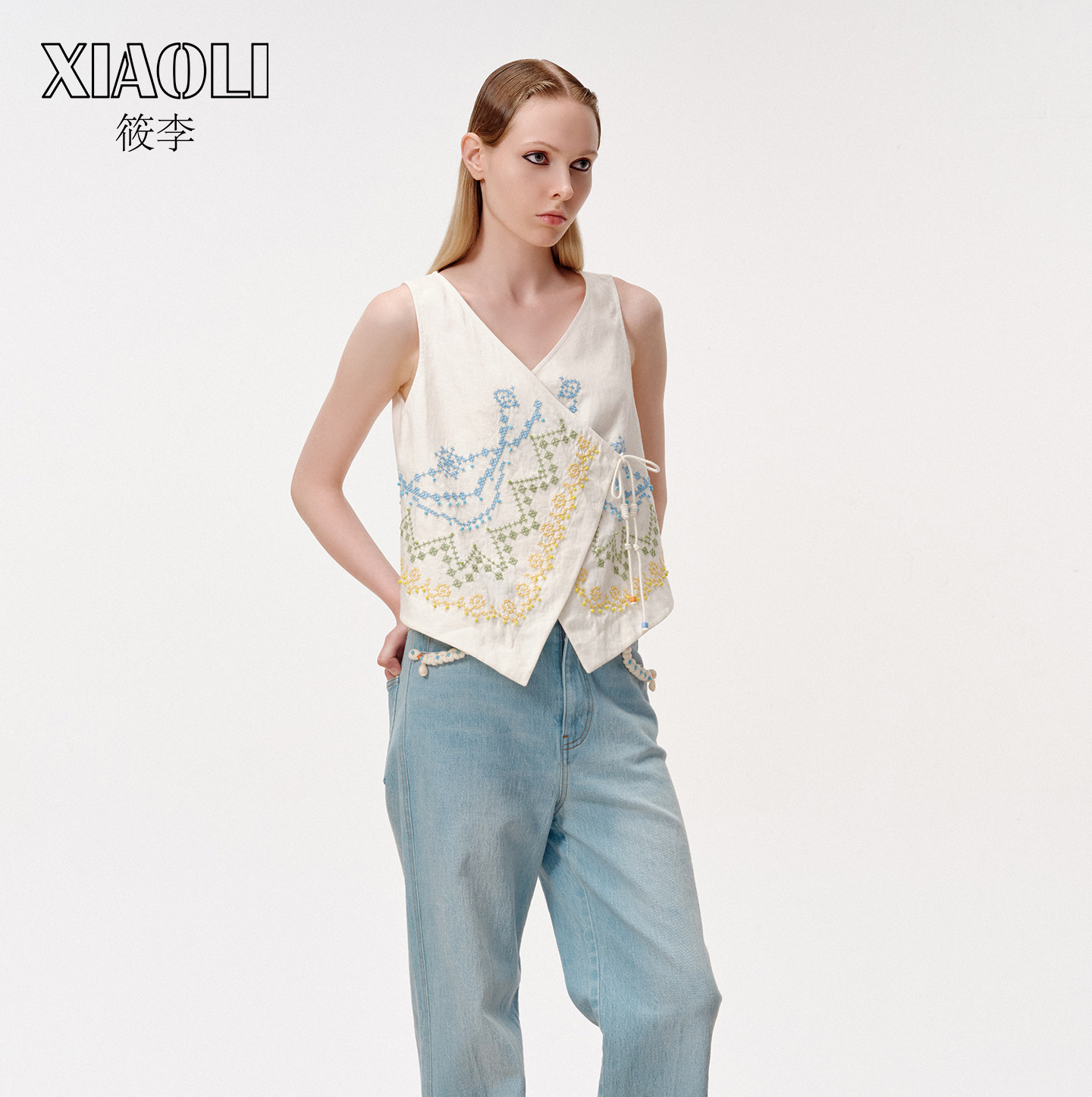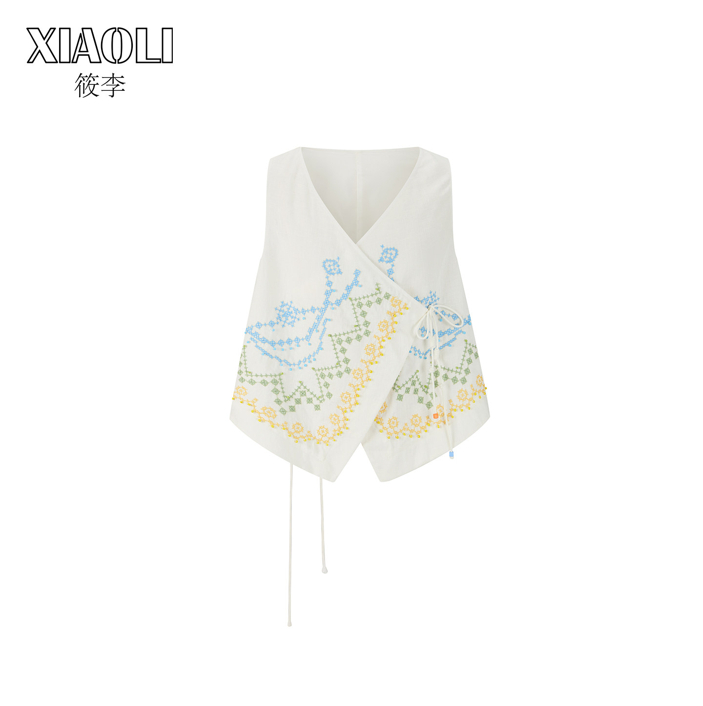 【XIAOLI筱李】亚麻米白十字绣宽松抽绳搭片马甲女上衣25秋新品