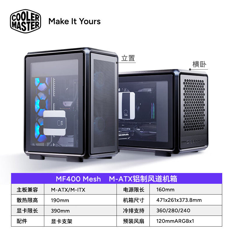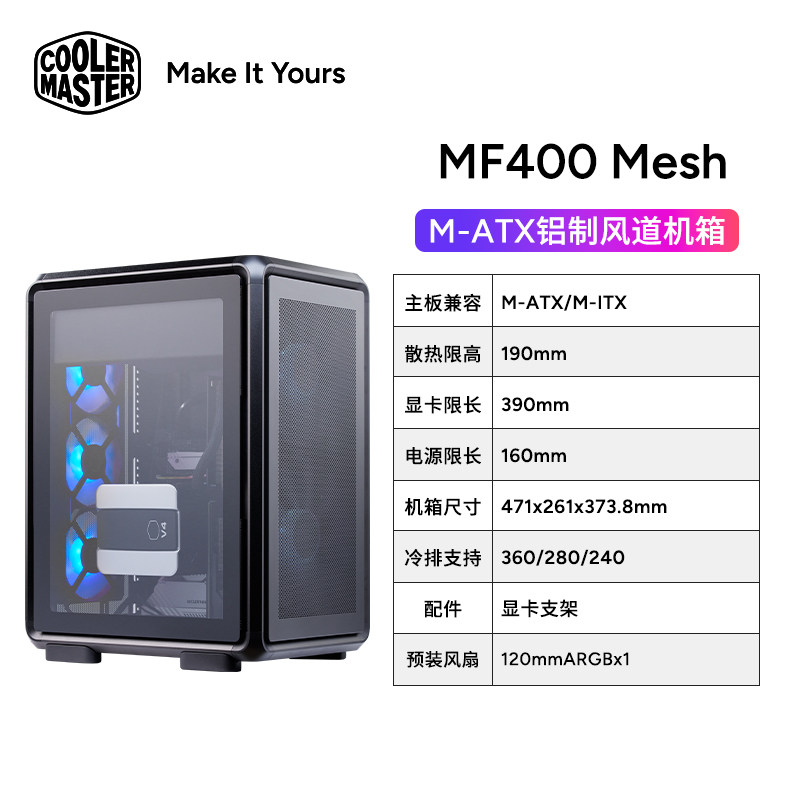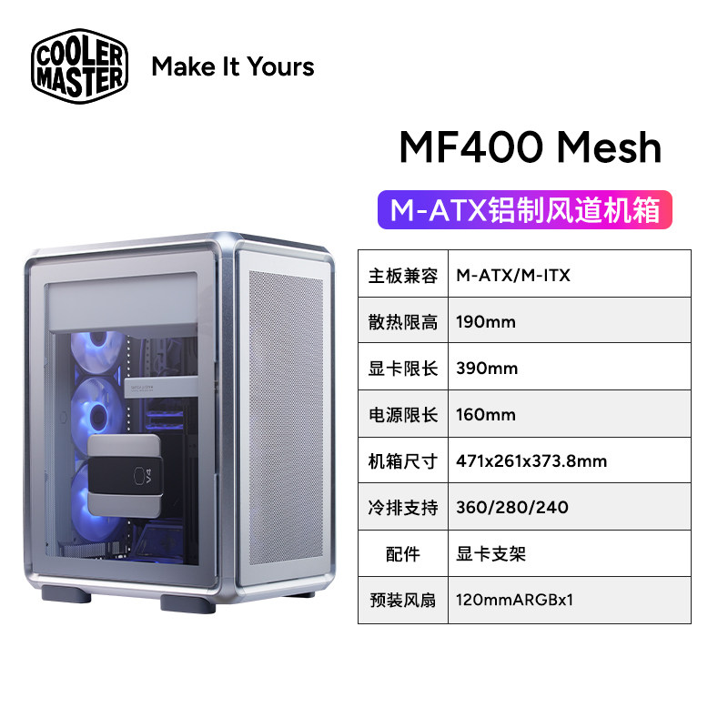 酷冷至尊MF400Mesh铝合金机箱MATX支持双摆放360水冷风道机箱