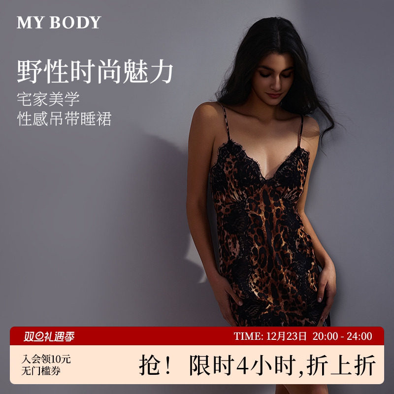 MYBODY商场同款吊带睡裙女性感禁欲豹纹蕾丝高级感薄款睡衣家居服