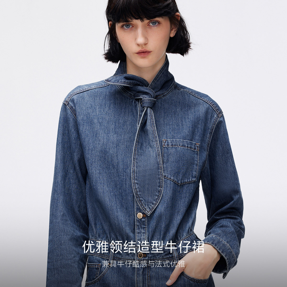 牛仔连衣裙,领结造型领口,高腰假两件拼接