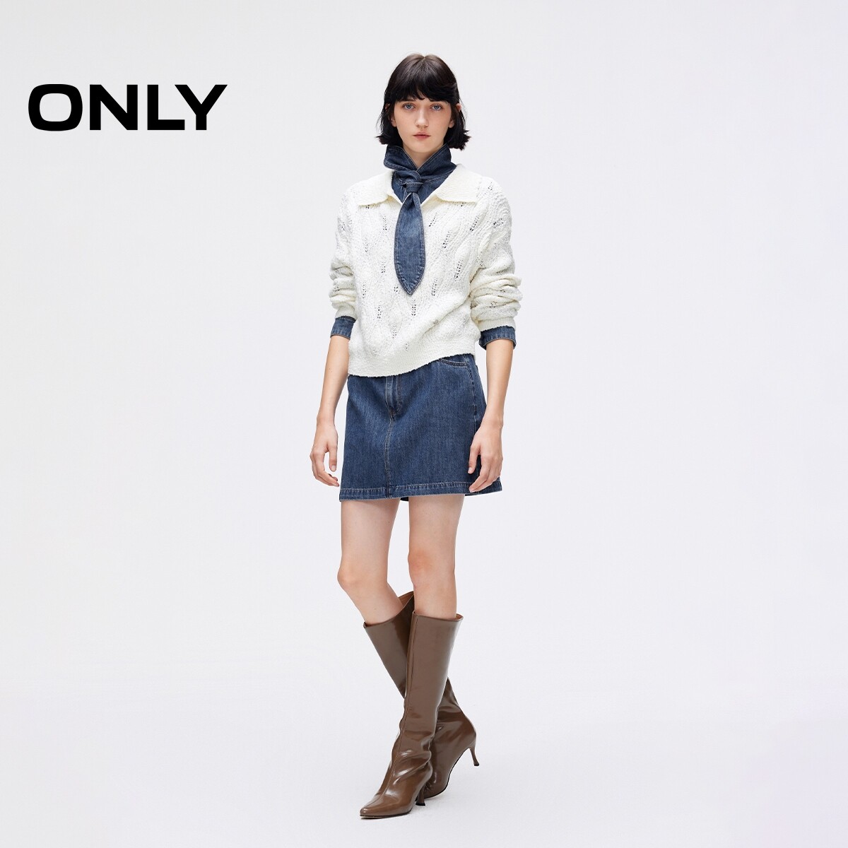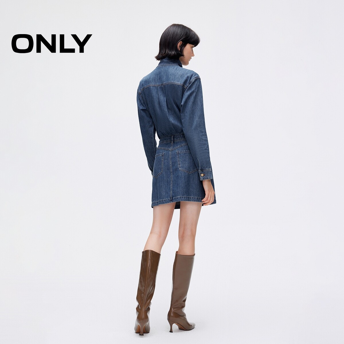 【ONLY奥莱】春季法式优雅领结水洗正肩假两件短裙牛仔连衣裙女