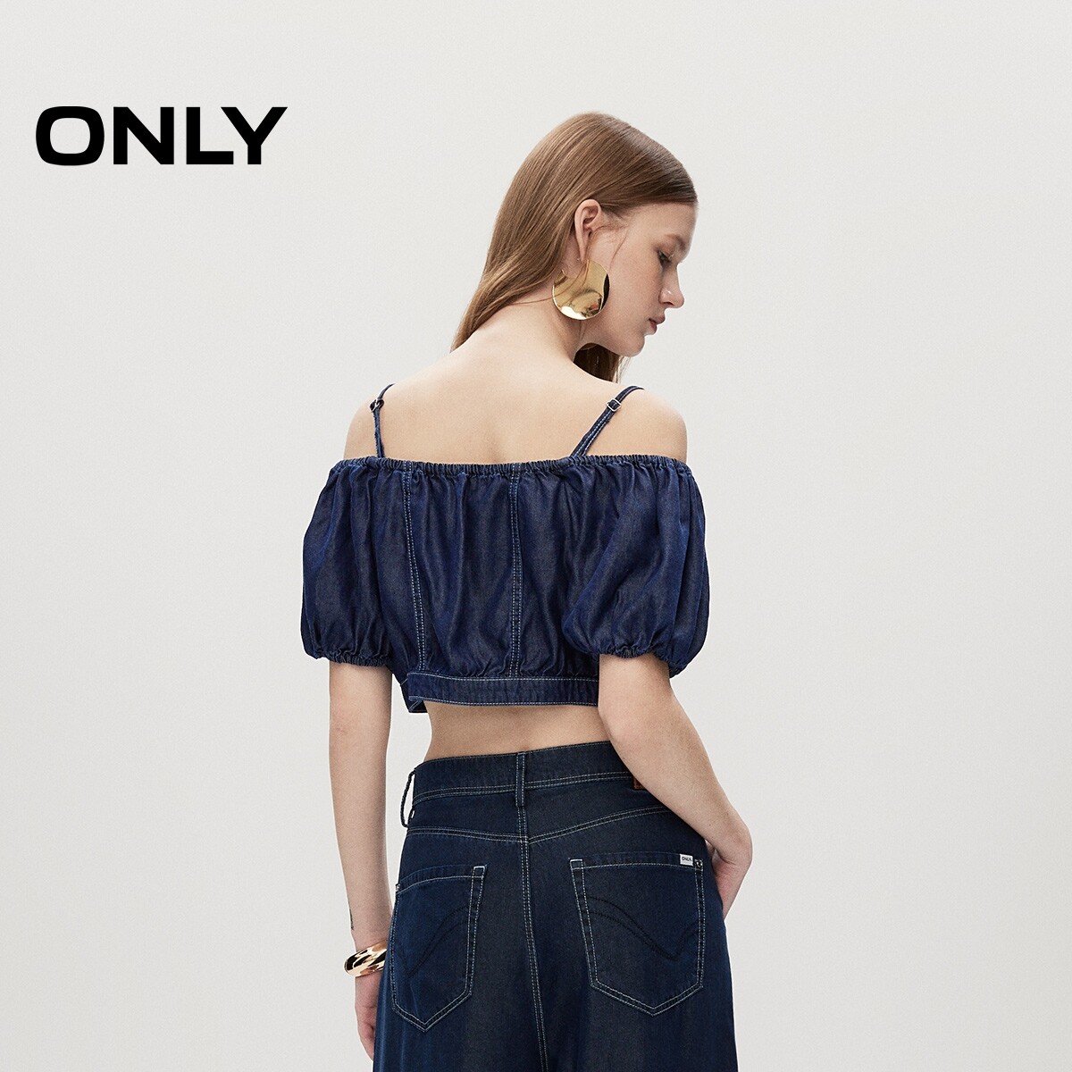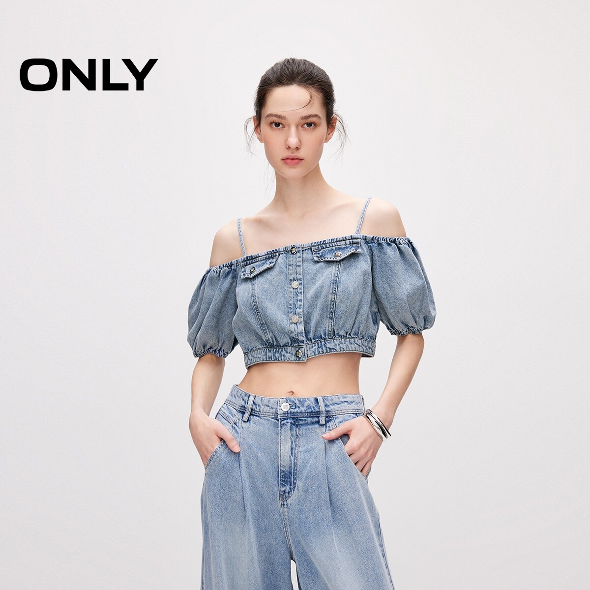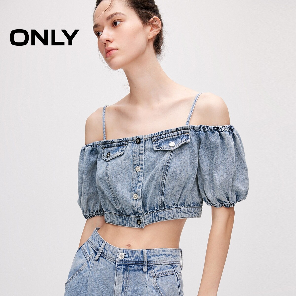 【ONLY奥莱】春夏新款辣妹泡泡袖莱赛尔牛仔短款雪纺衫女