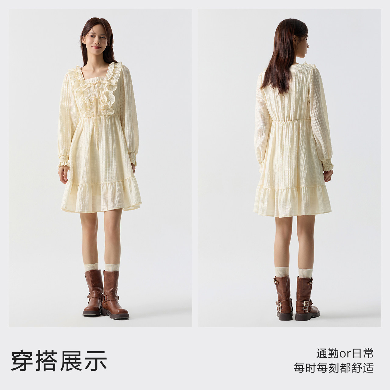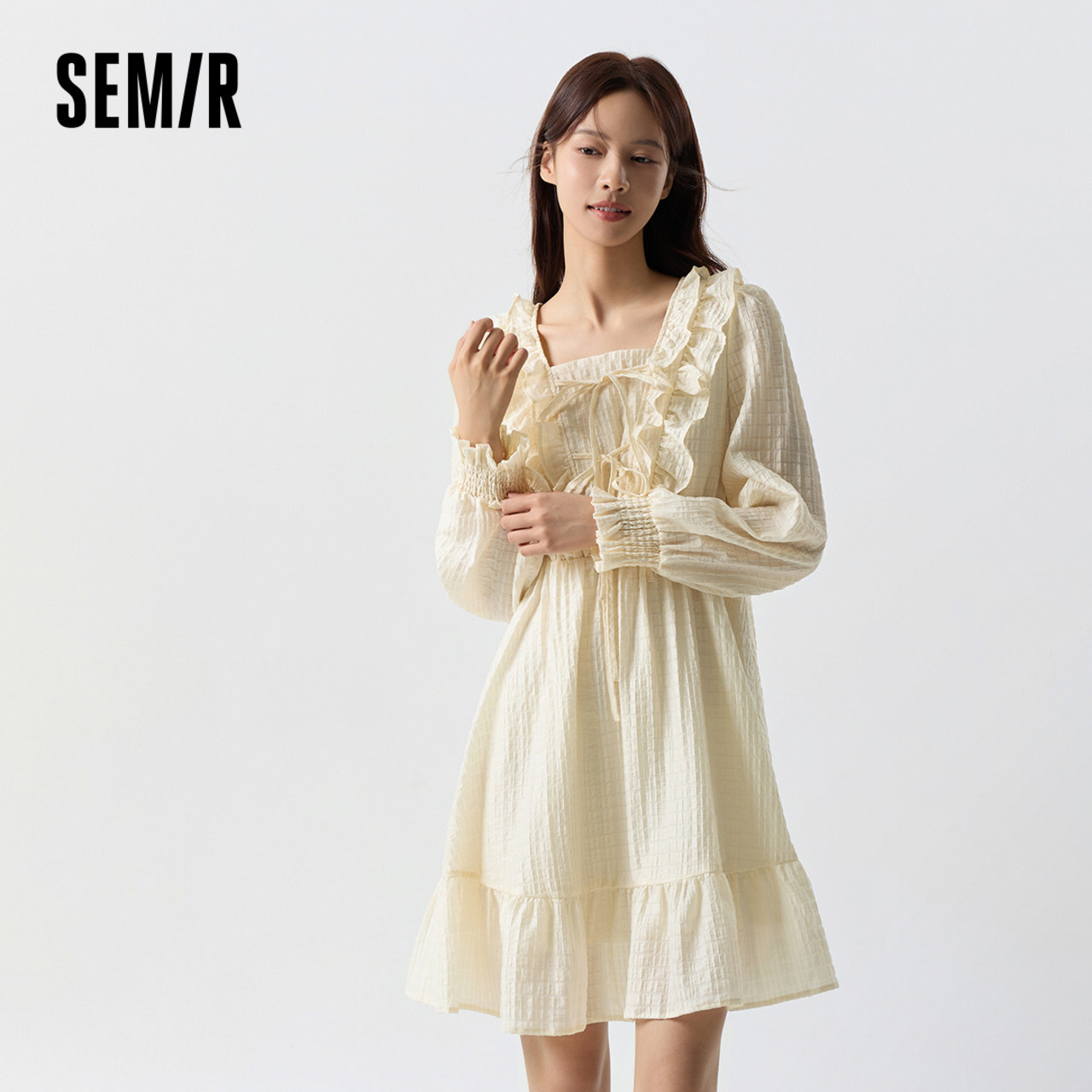 森马连衣裙女荷叶边蝴蝶结浪漫2024春季新款甜美方领肌理裙子温柔