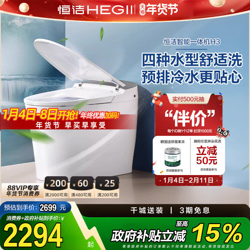 【政府补贴15%】恒洁智能马桶一体家用脚感零压坐便器舒适洗H3