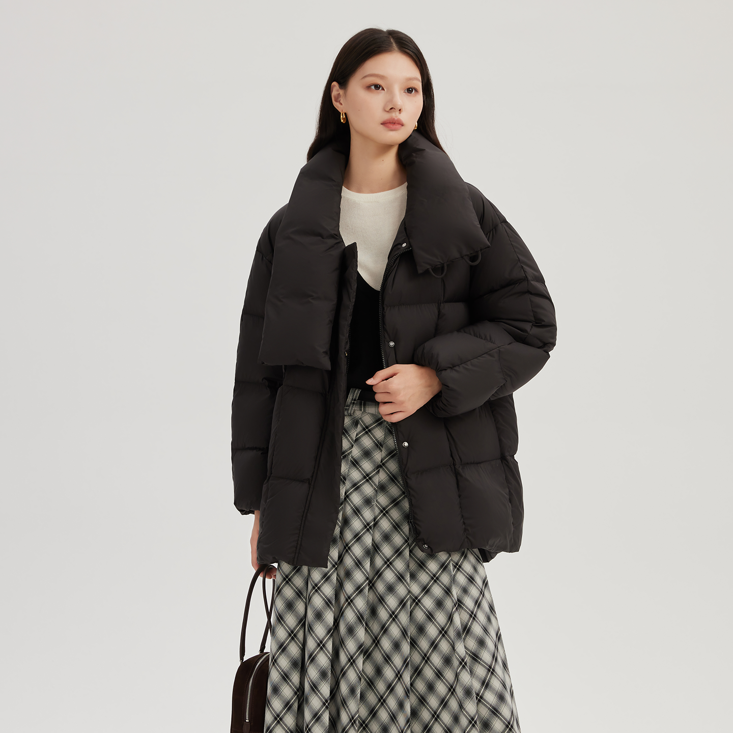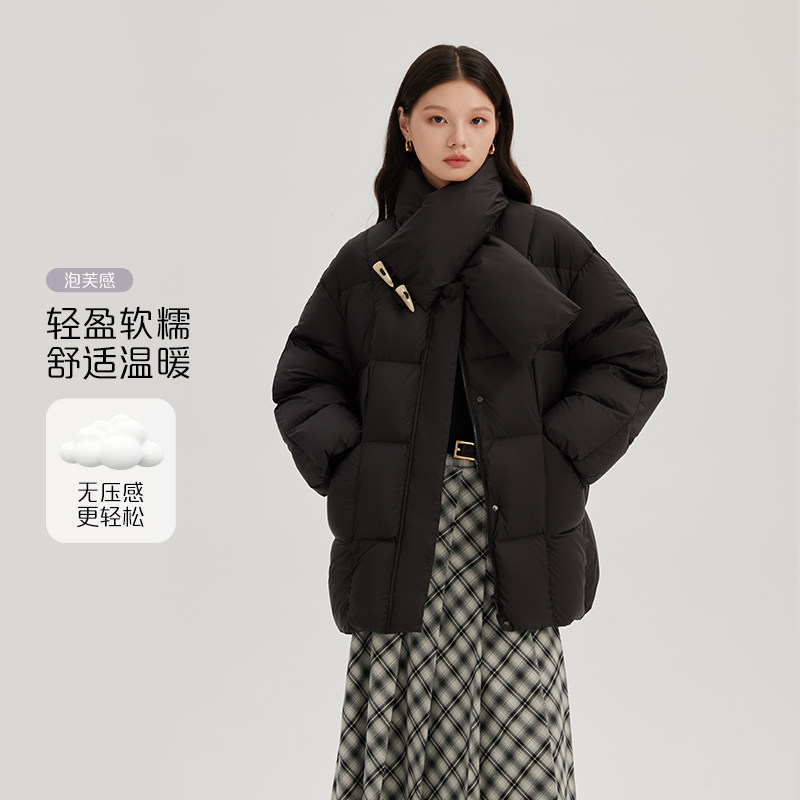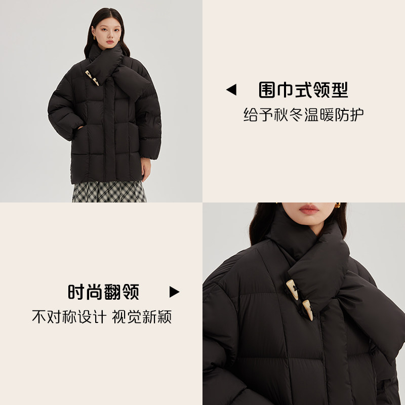 艾莱依羽绒服冬季女士新款围巾领温暖防风牛角扣质感鸭绒简约外套