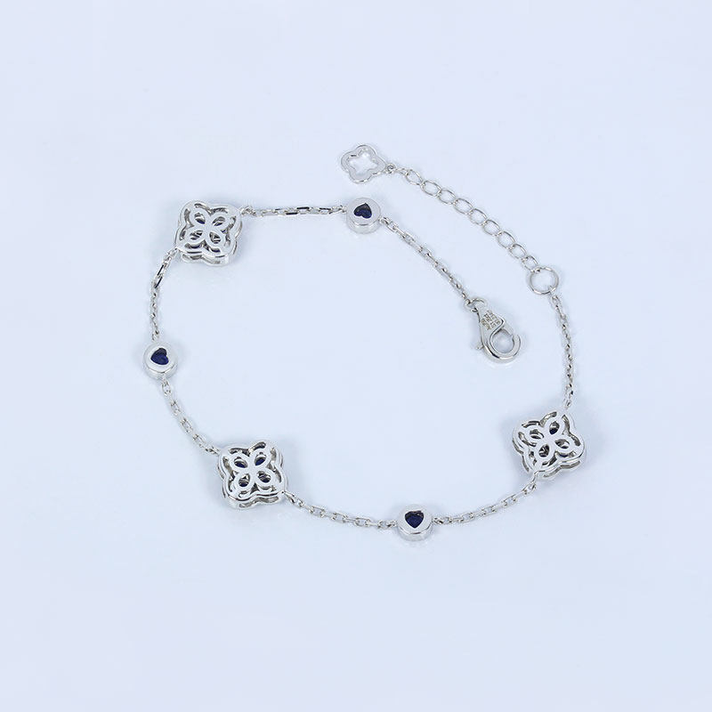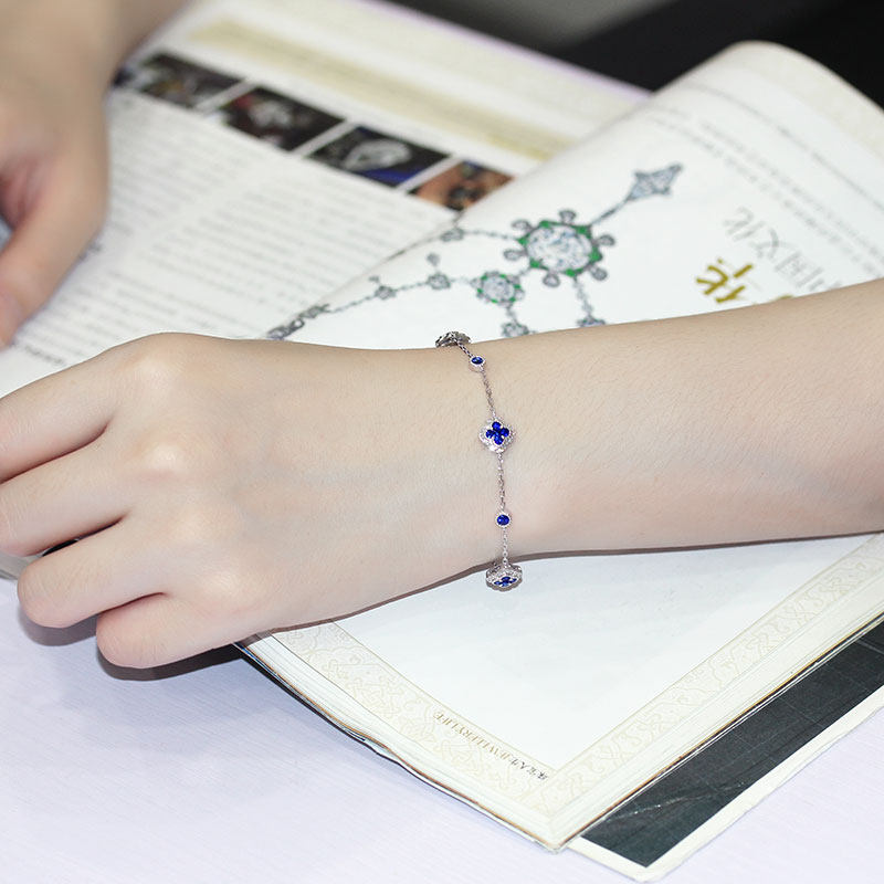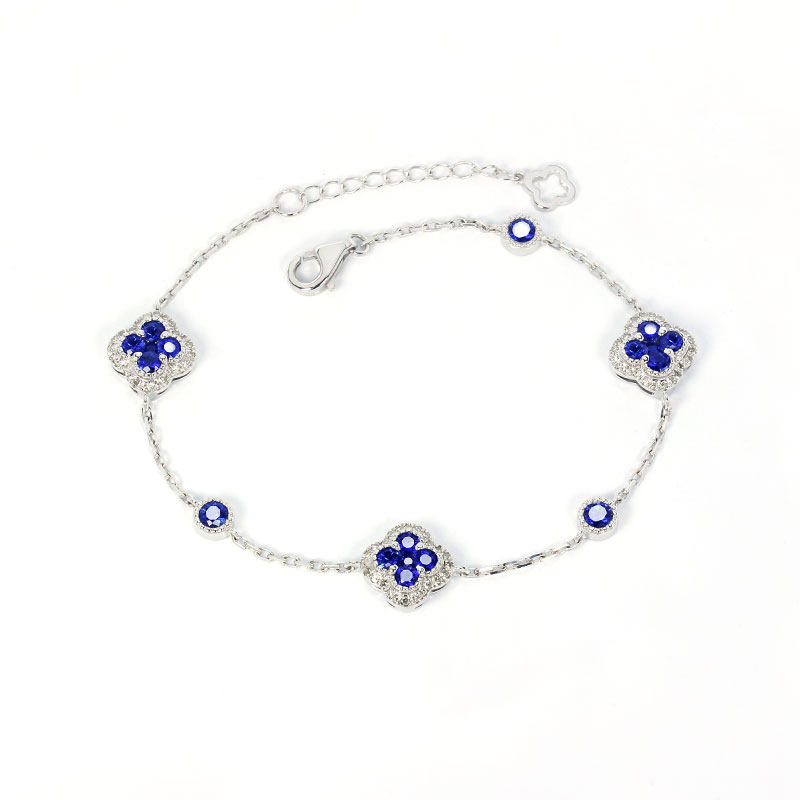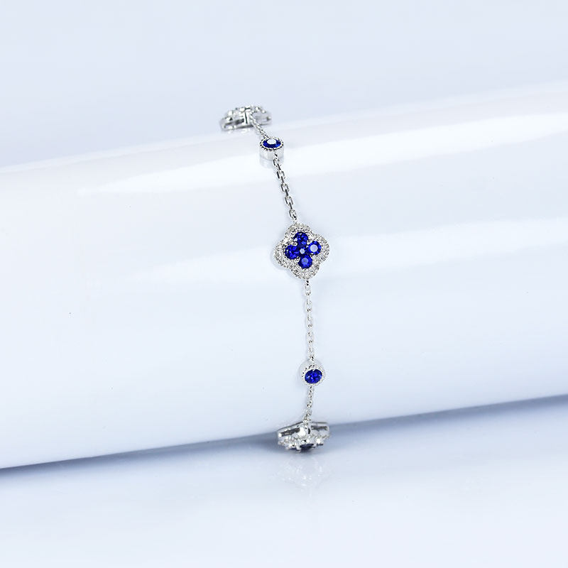 18K白金天然皇家蓝宝石幸运四叶草手链 镶钻石可调节满圈手镯女款