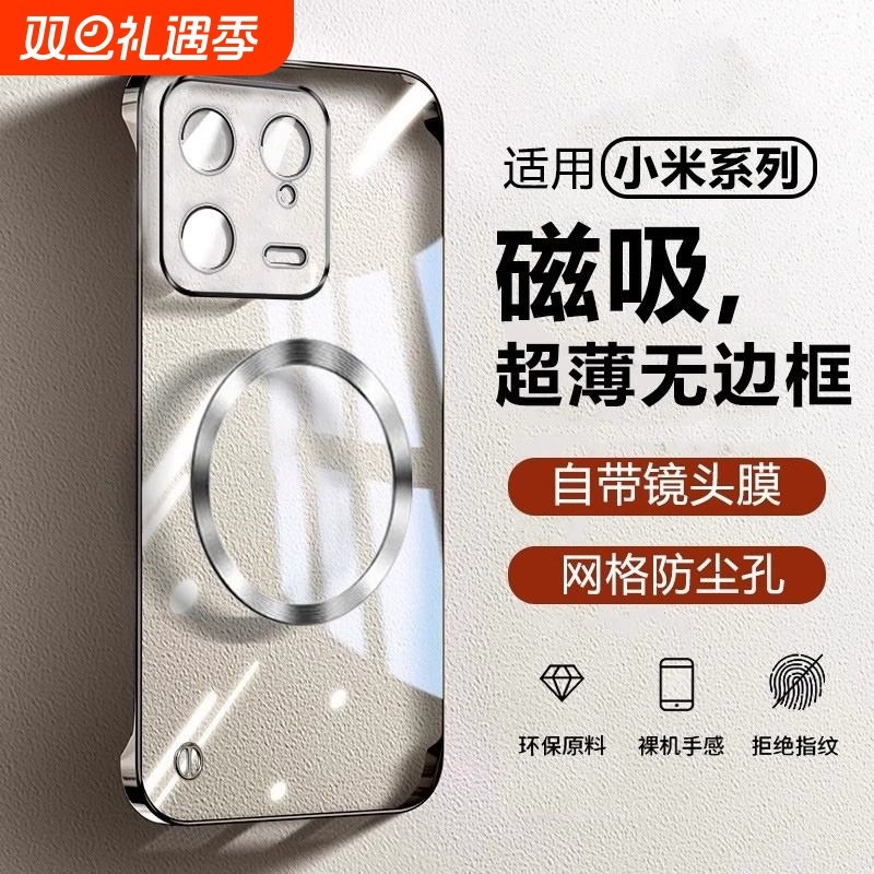磁吸无边框适用小米14Ultra手机壳高级感13Pro保护套硬壳半包超薄透明新款12镜头膜12S防摔手感全包电镀自带