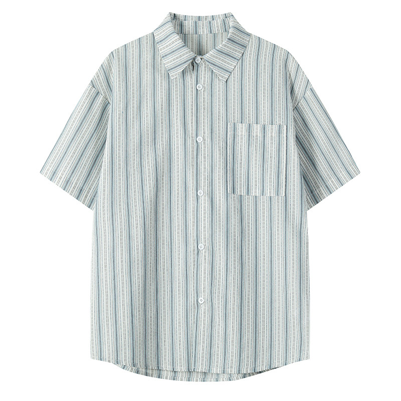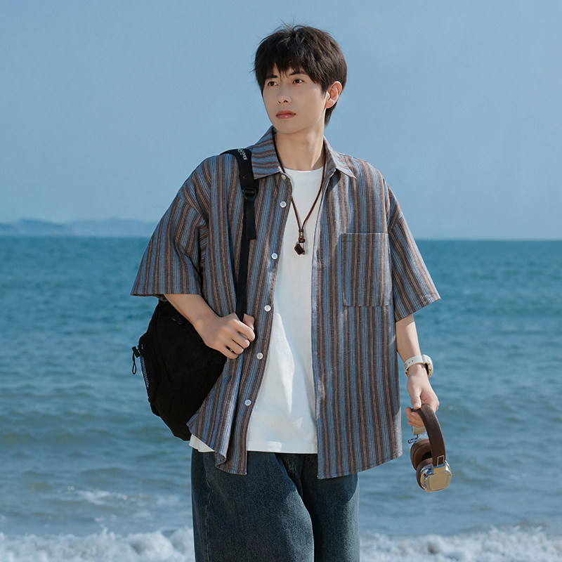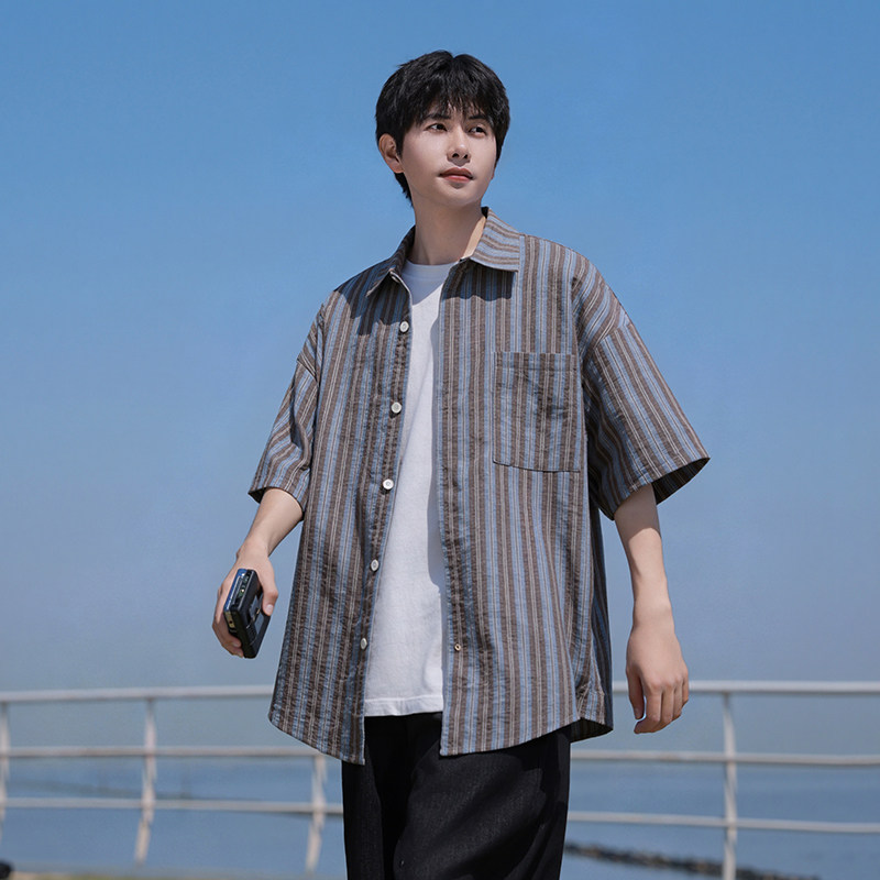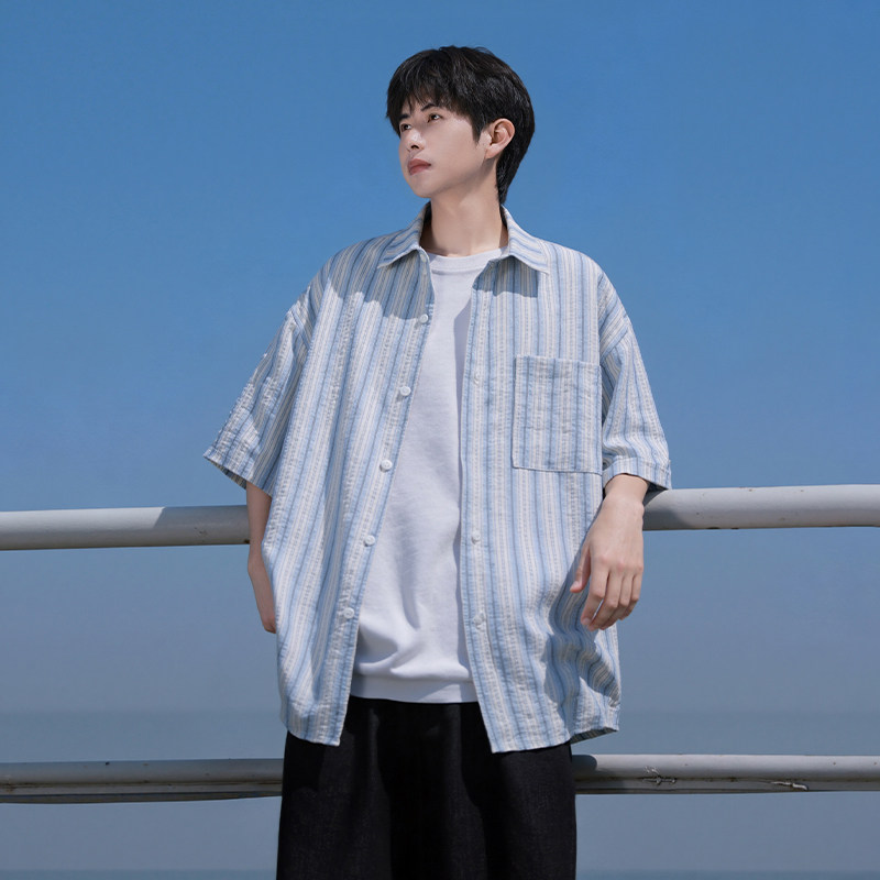 回力冰丝条纹短袖衬衫男士夏季薄款青少年高级感休闲衬衣男生外套