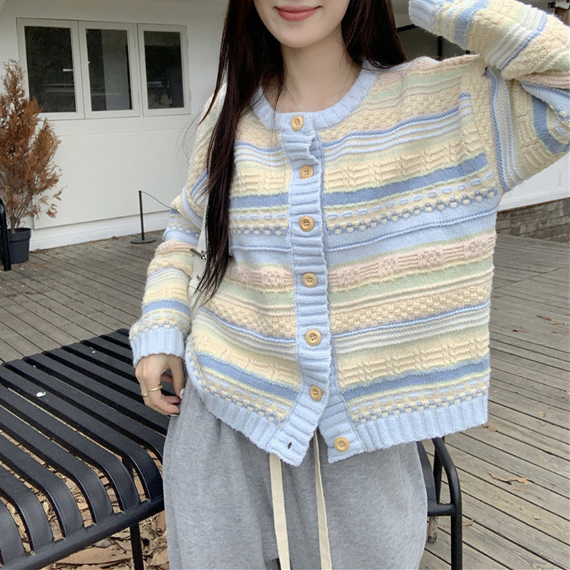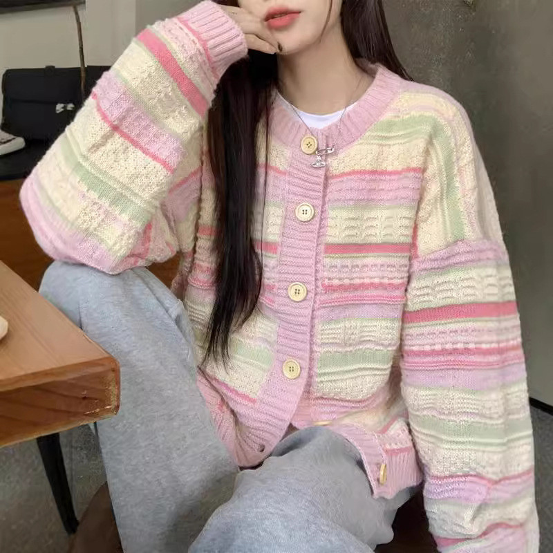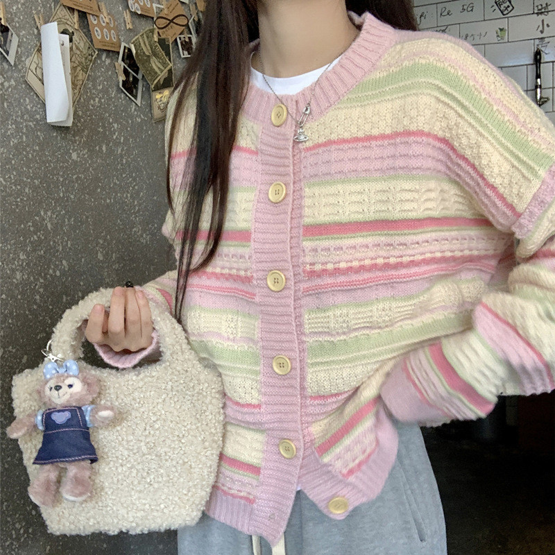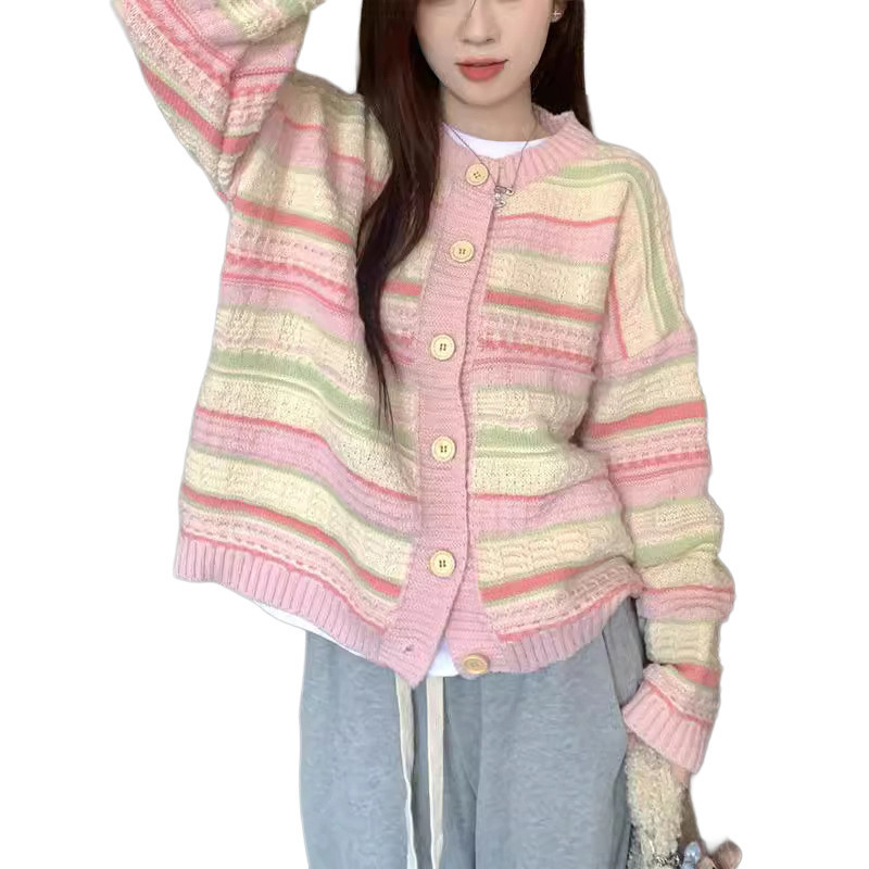 LE真维斯小清新女装宽松圆领毛衣外套 2026春季新品甜美条纹开衫