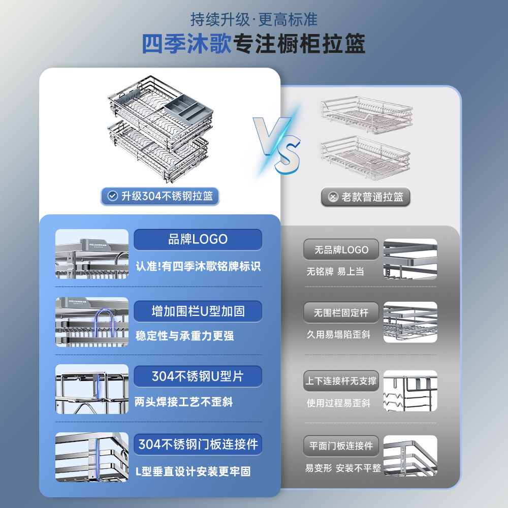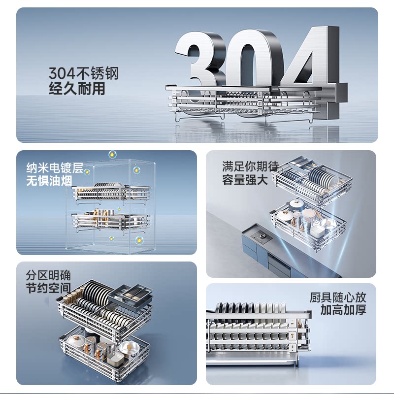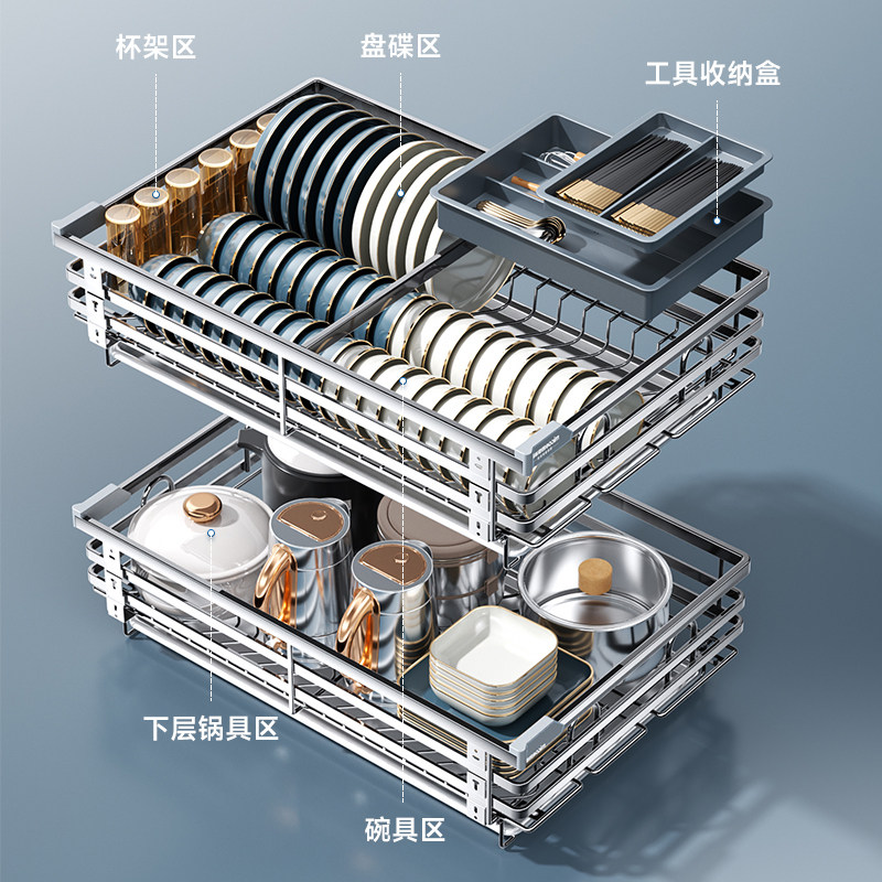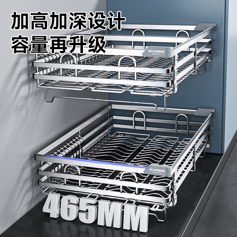四季沐歌拉篮厨房橱柜304不锈钢双层抽屉式碗架碗碟篮碗柜收碗篮