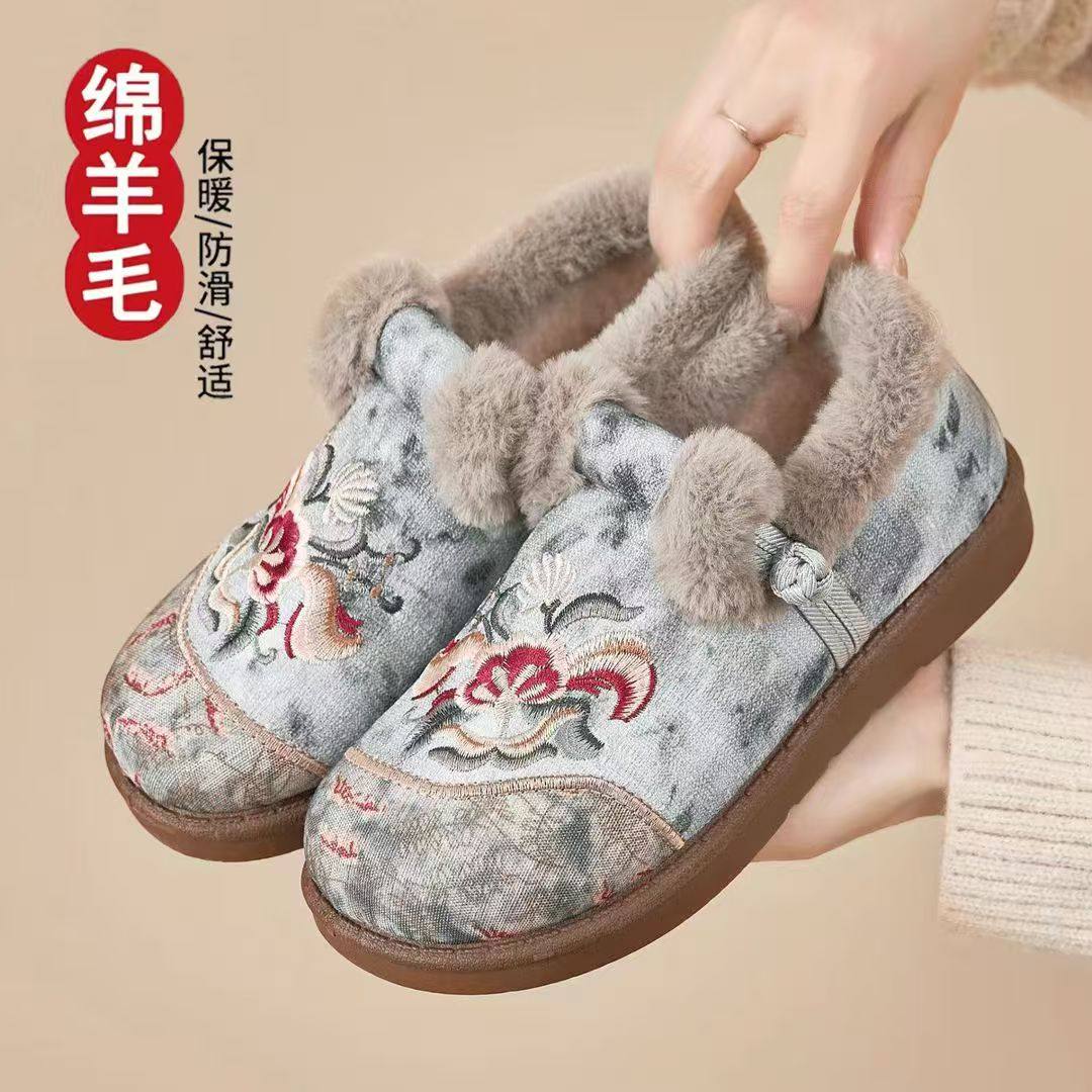 2025绵羊毛冬季老北京棉鞋女加绒加厚保暖妈妈鞋一脚蹬厚底绣花鞋