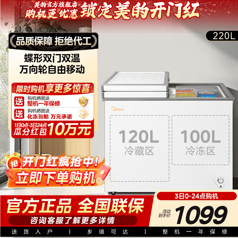 美的220升双温冰柜家用冷藏冷冻两用小型冷柜商用玻璃门卧式冰箱