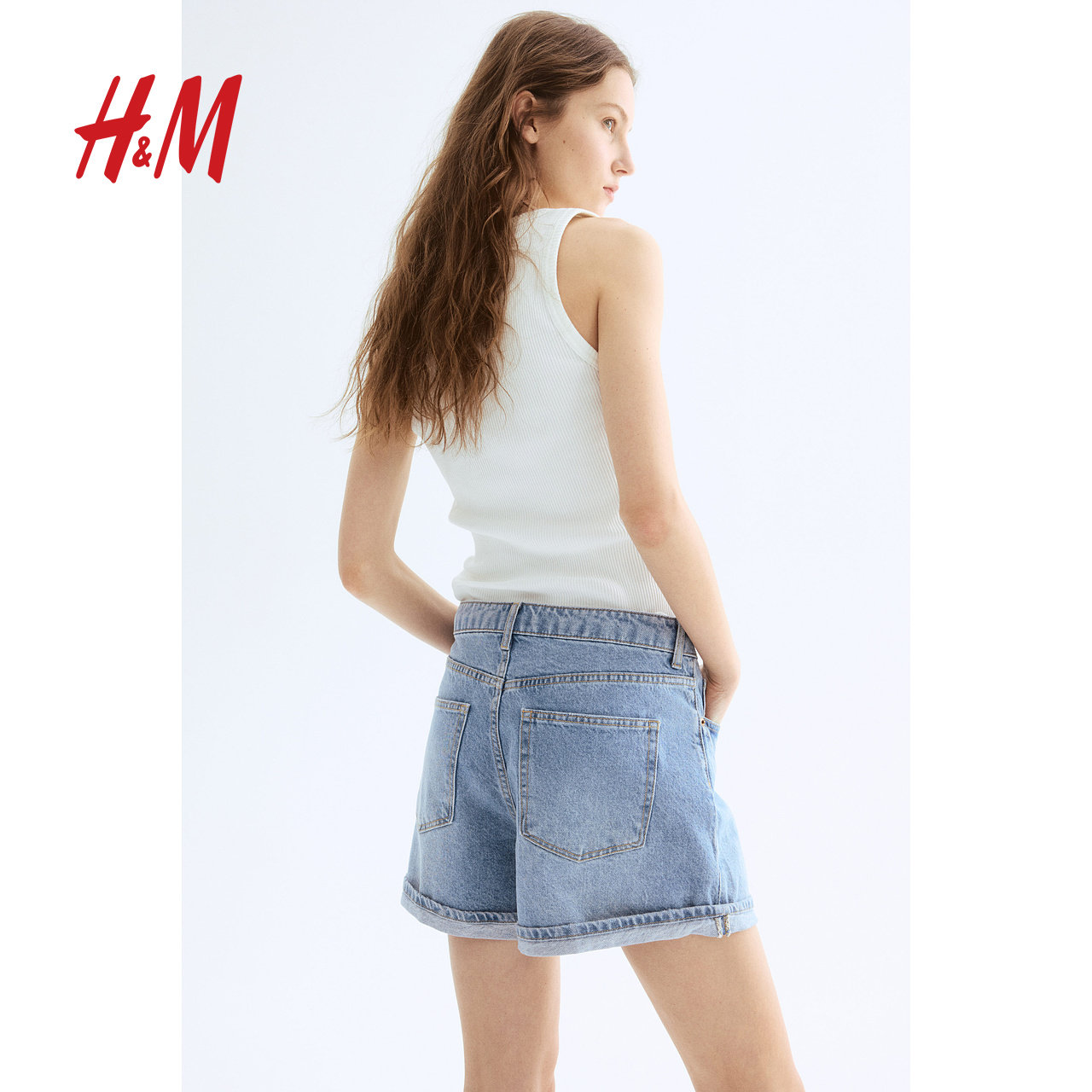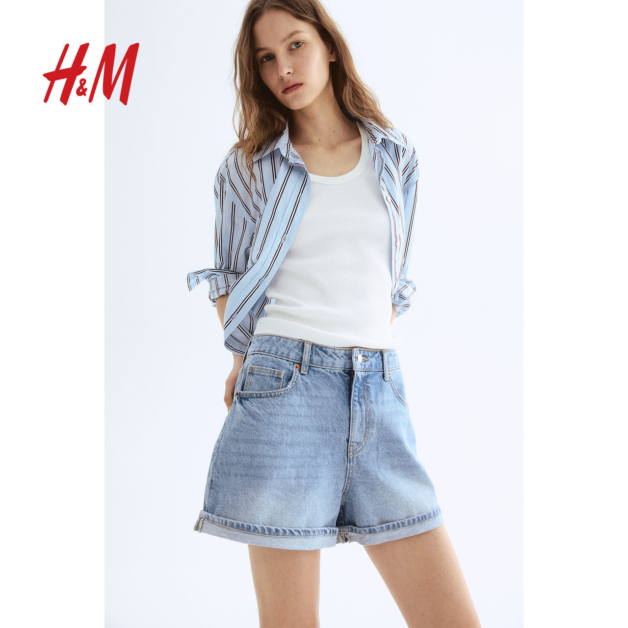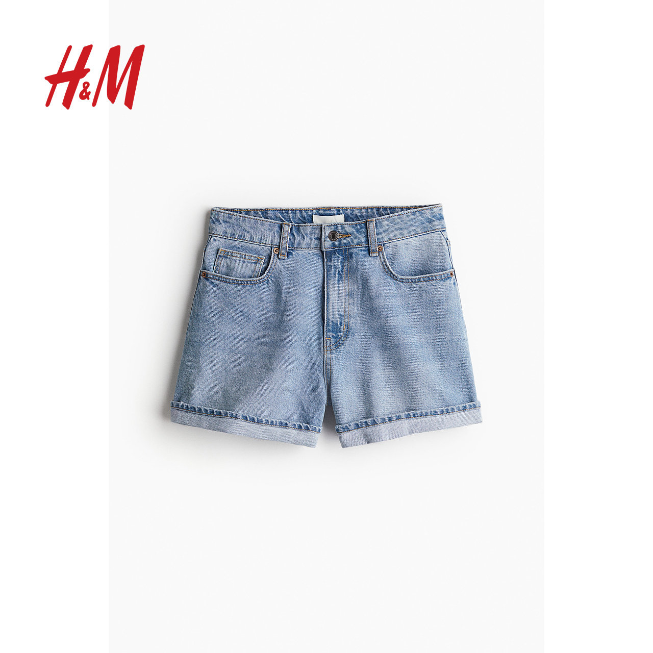 HM女装牛仔裤春季直筒高腰棉质简约舒适时尚休闲辣妹短裤1222120