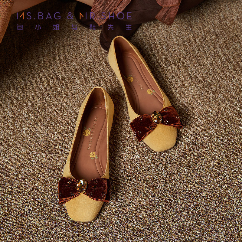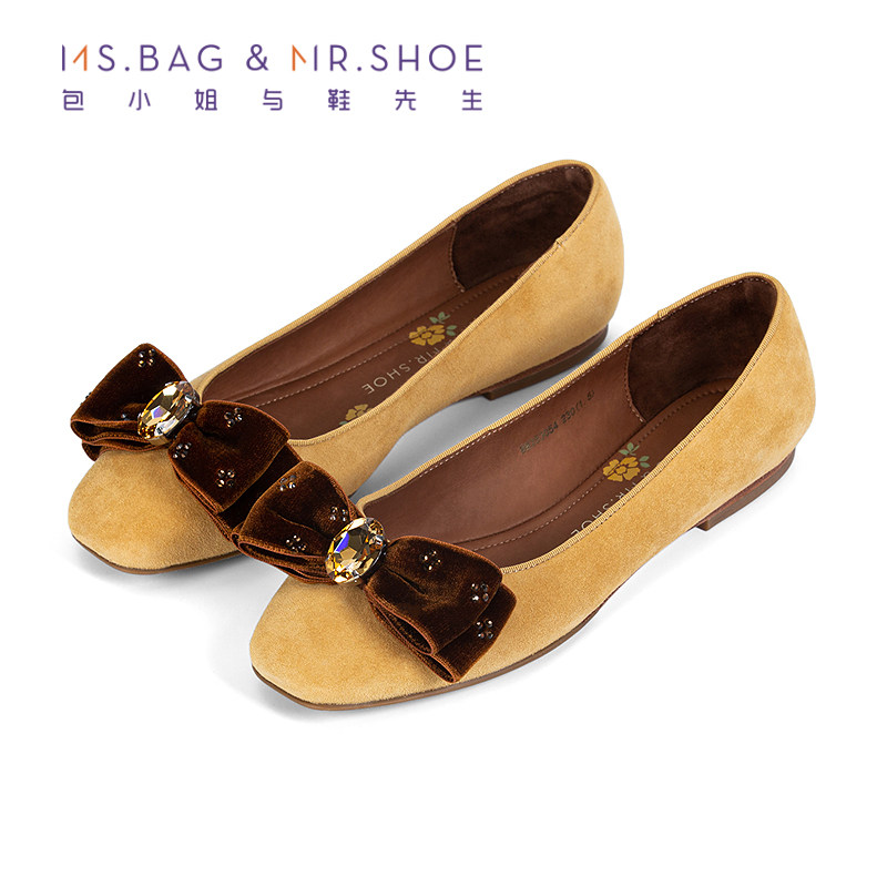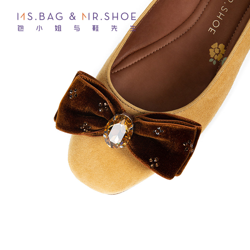 包小姐与鞋先生2025年秋季羊反绒烫钻蝴蝶结平底单鞋女253054