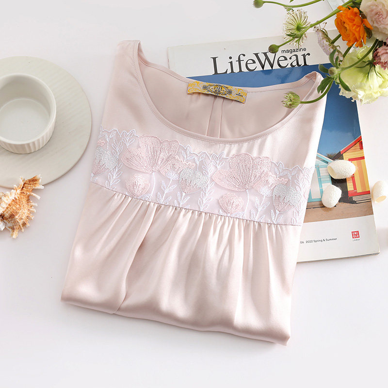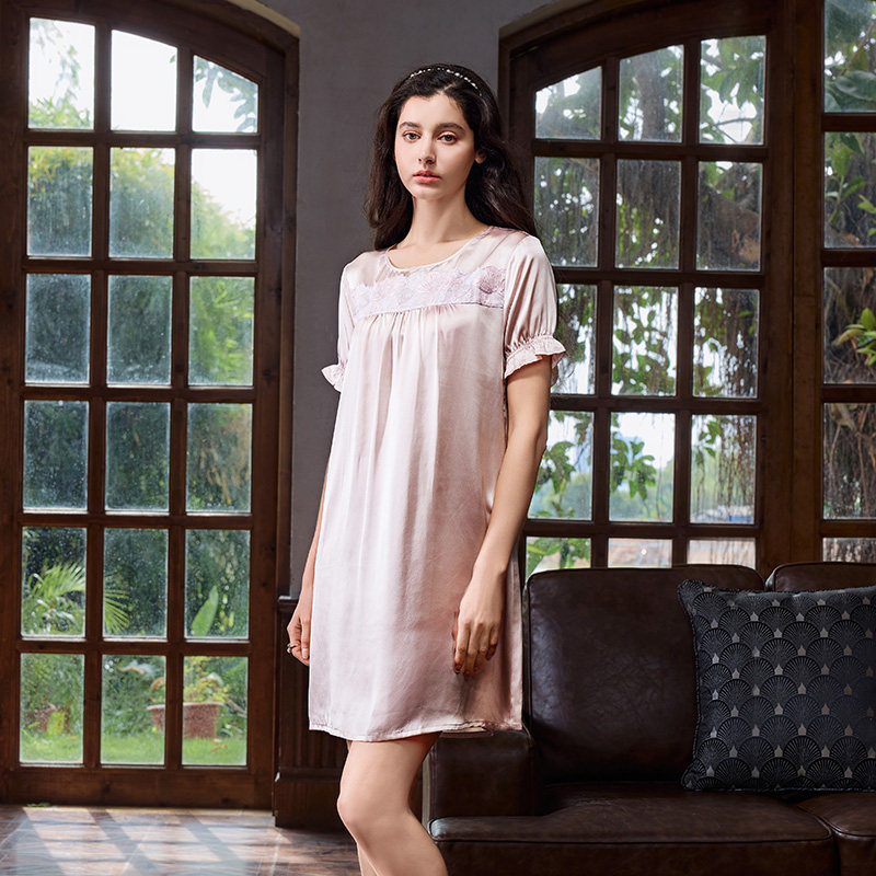 美标新款19姆米重磅短袖真丝睡裙女春夏桑蚕丝家居服丝绸蕾丝睡衣