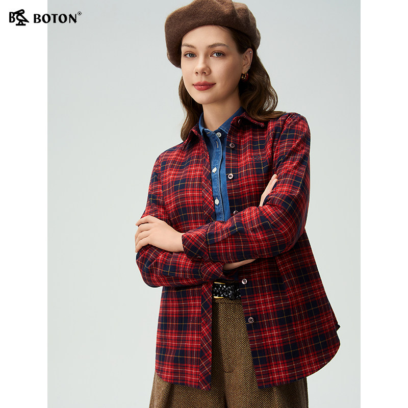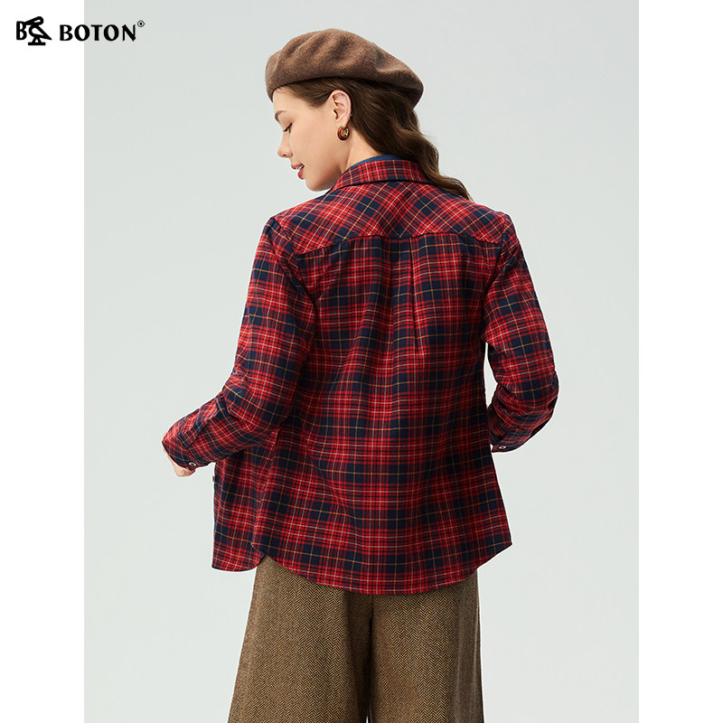 波顿秋季新款翻领长袖磨毛格子衬衫女士衬衣修身显瘦休闲百搭上衣